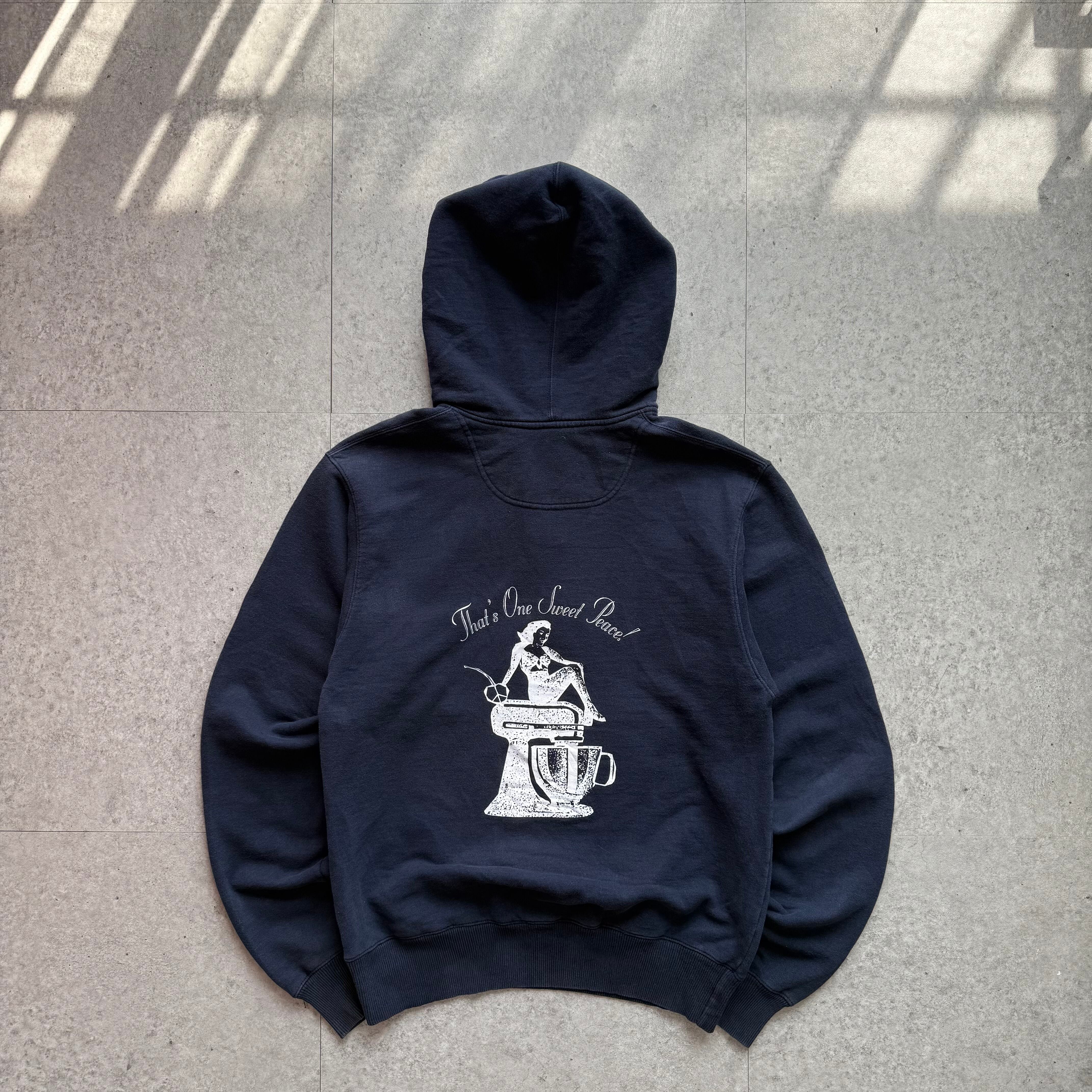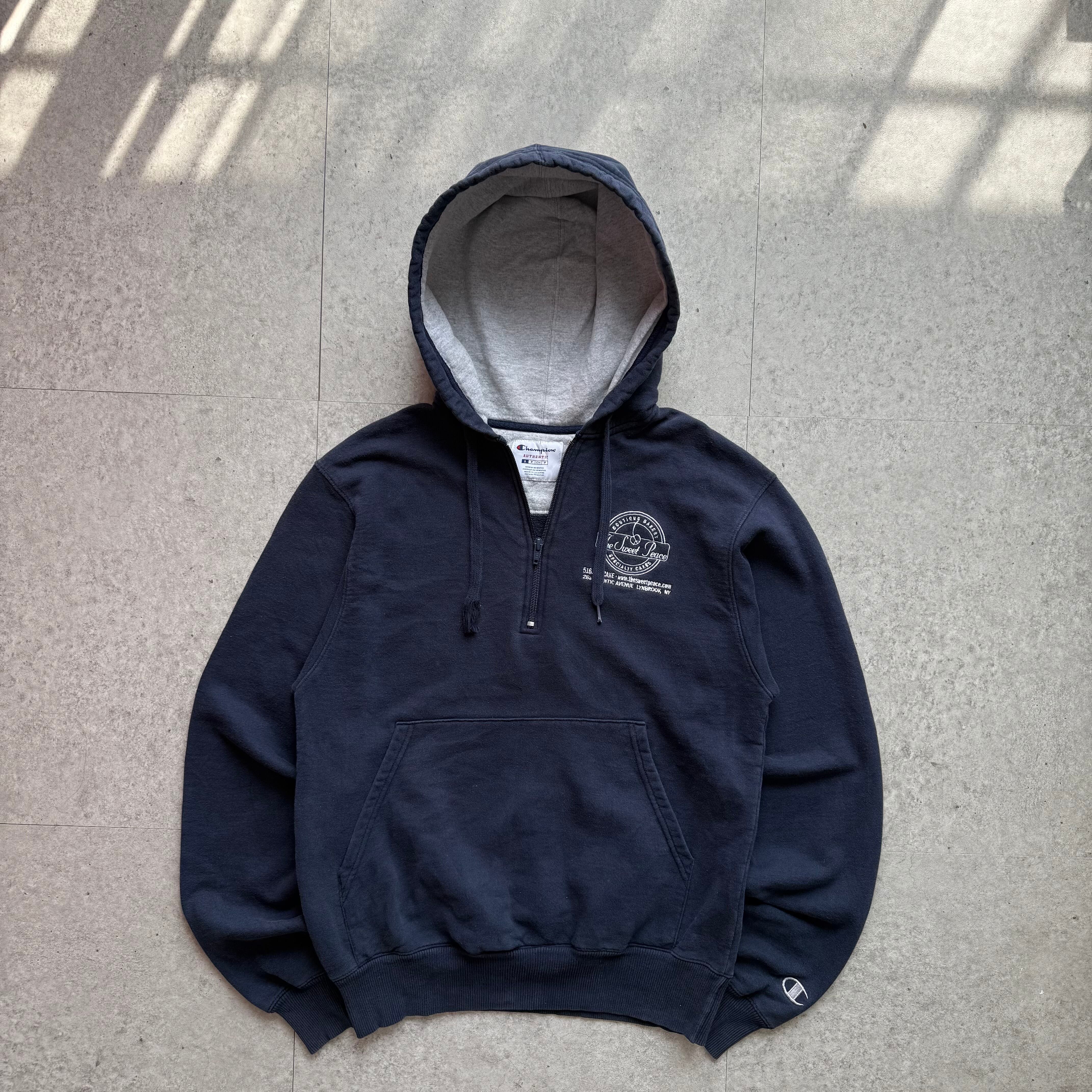 ネイビーのハーフジップスウェットは、程よくゆったりしたシルエットにカレッジライクなロゴを胸元とバック施したデザイン。カジュアルながらも落ち着いた色味で雰囲気があり、デニムとの相性は抜群です。季節を問わず着回しできる万能トップス。