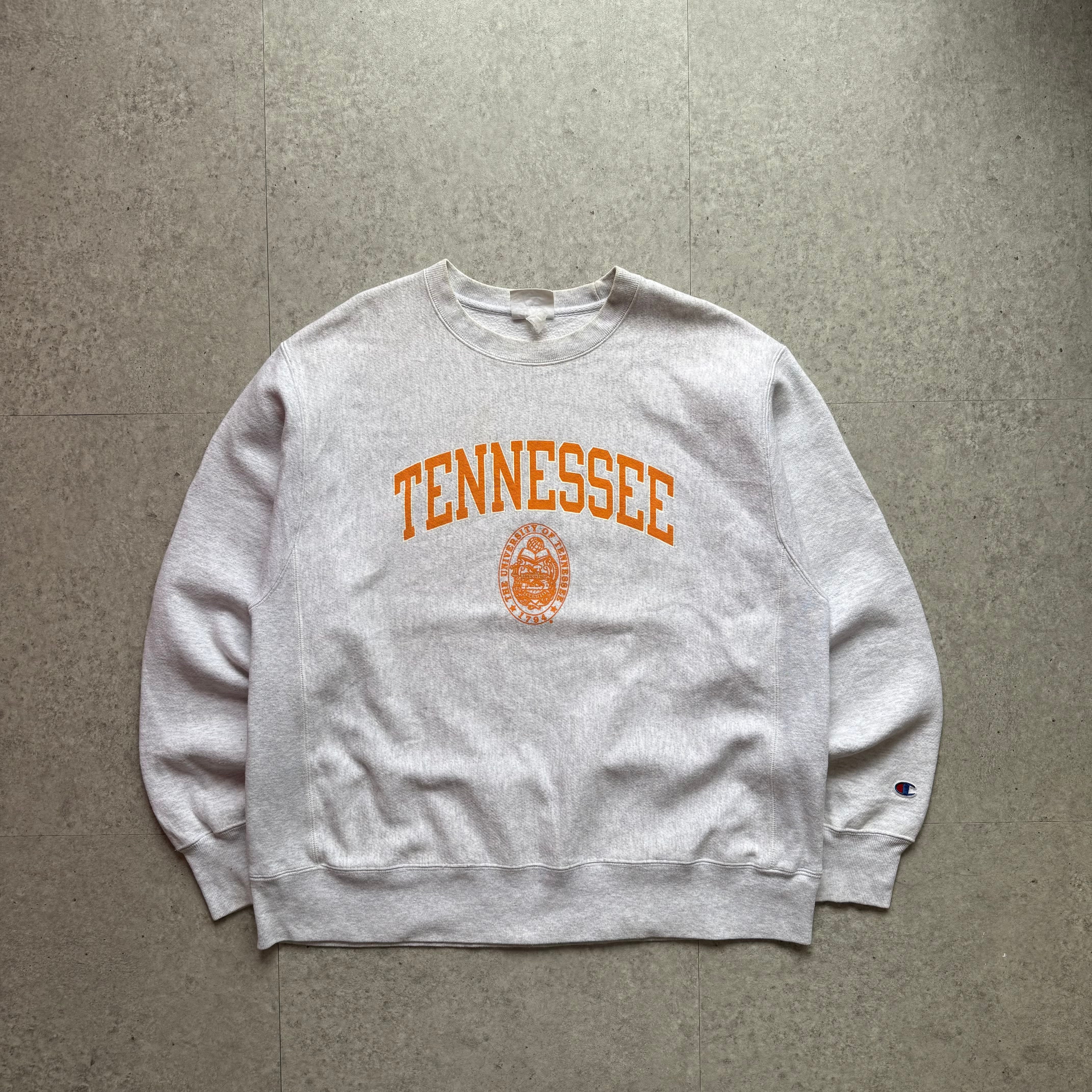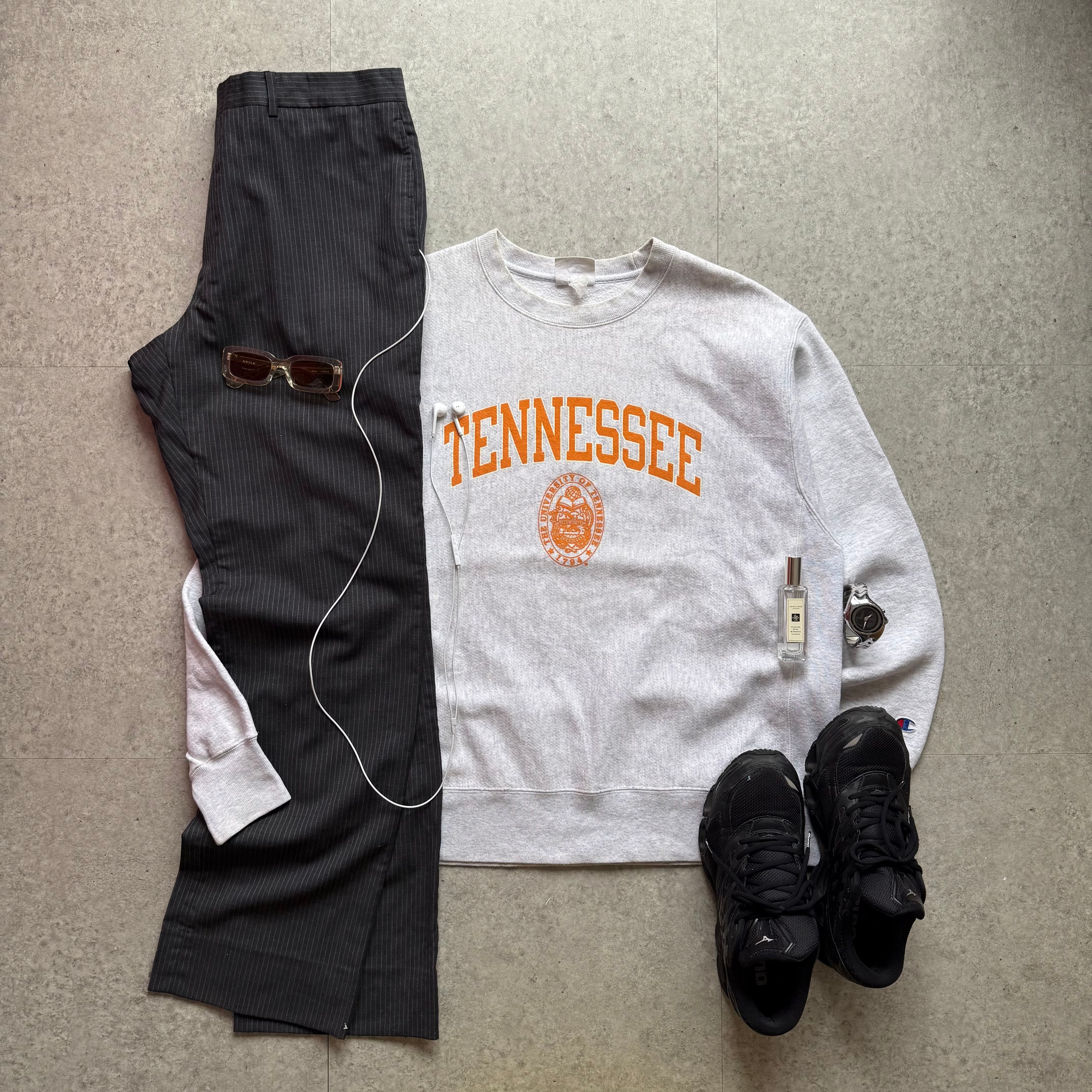 チャンピオンのリバースウィーブスウェットを短丈加工で仕上げ、大きめのロゴが映える一枚。グレー地にオレンジの「TENNESSEE」プリントが効いており、存在感のあるトップスです。スラックスと合わせることでストリートに寄せすぎず、大人っぽいバランスを実現。カジュアルながら品のあるスタイルに仕上がります。※襟周りに薄い黄ばみがございます。