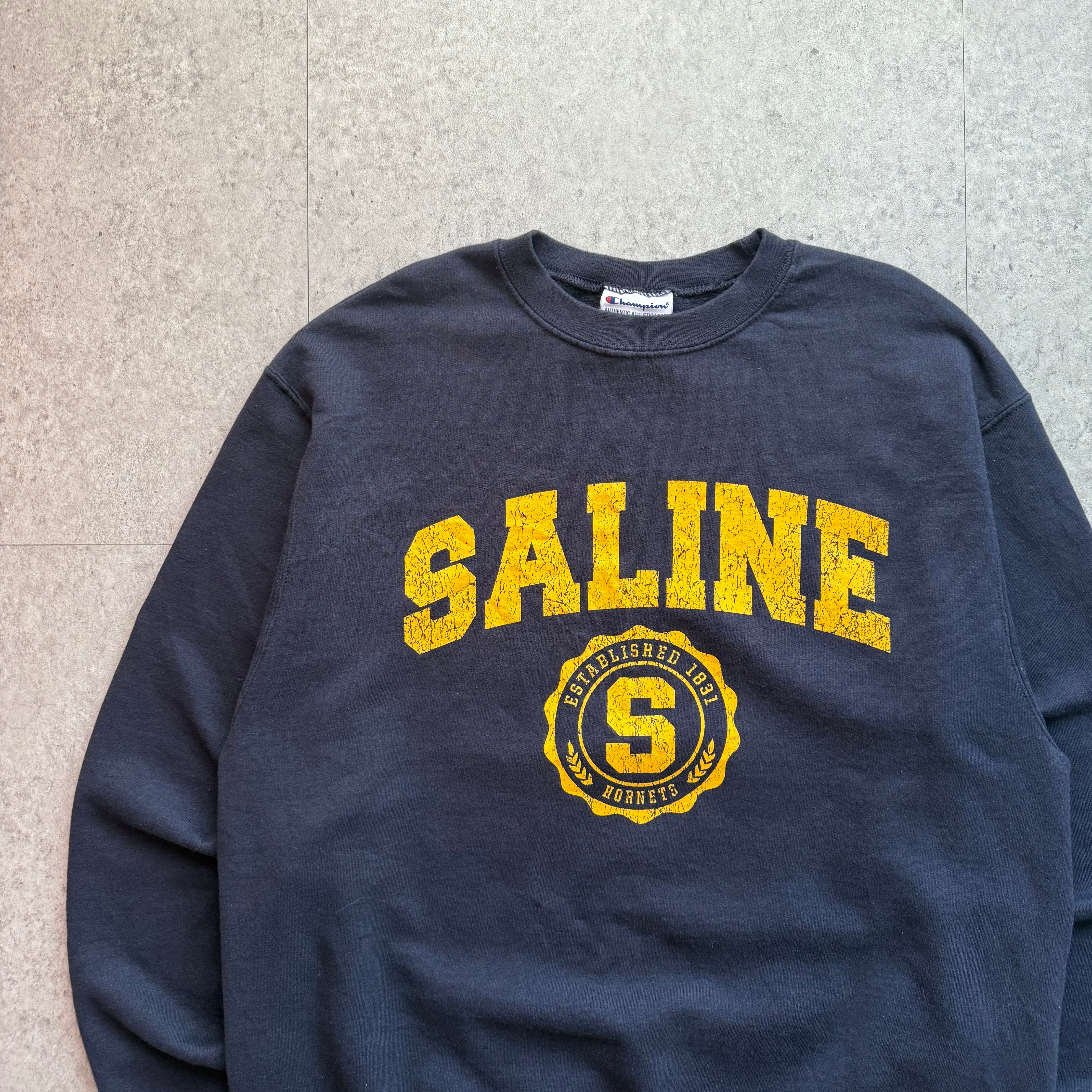 濃紺のChampionスウェットにイエローの「SALINE」ロゴが大きくプリントされたクラシックな一枚。カレッジスウェットならではのスポーティーさに、色落ちしたような掠れプリントが加わり、ヴィンテージらしい雰囲気を強く感じさせます。ブラウンのパンツと合わせれば落ち着きのあるカレッジスタイルが完成。日常からストリートシーンまで幅広く活躍してくれるアイテムです。