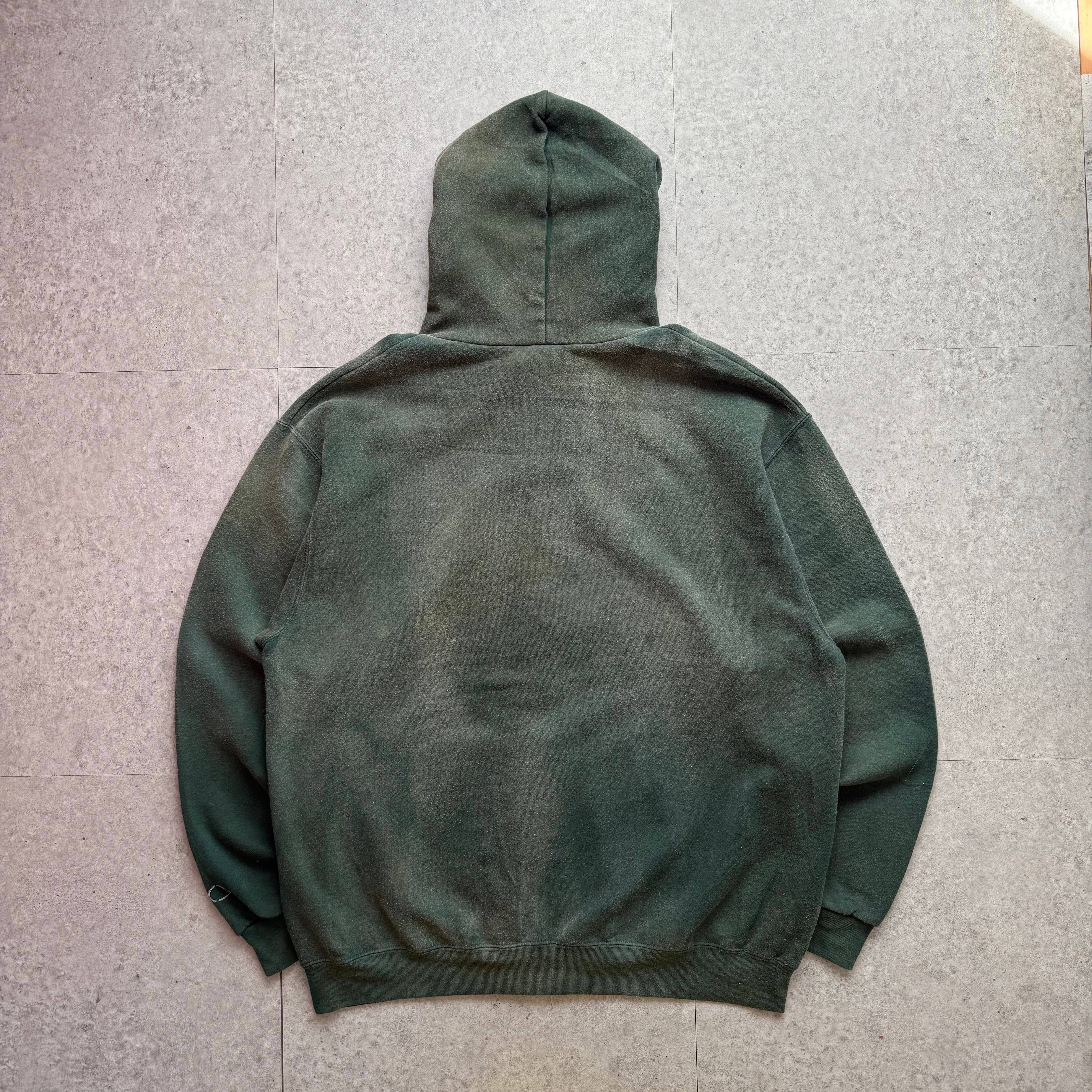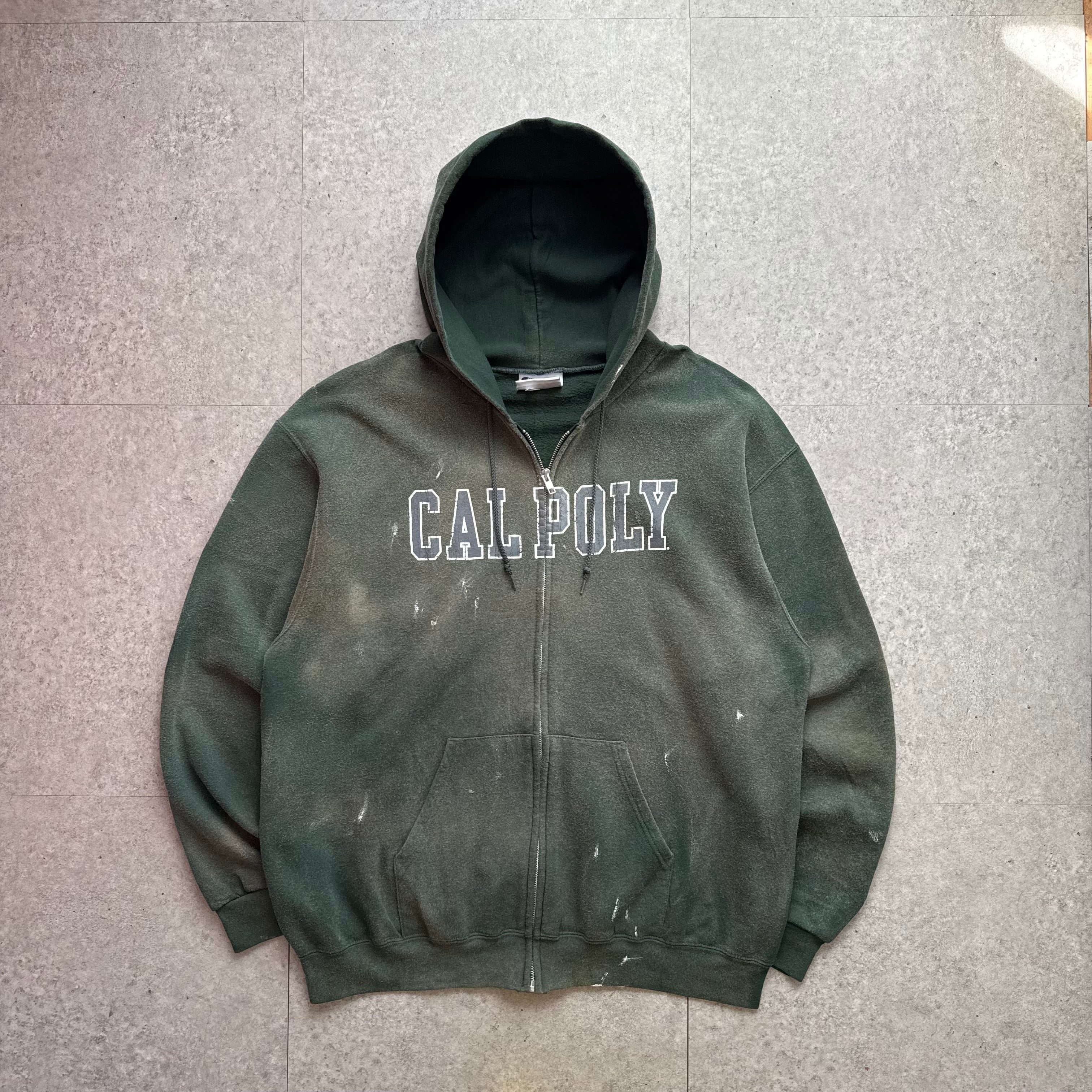 深緑のカレッジ・ジップフーディ×ブルーデニム。ゆるめの肩落ちとたぷんとした袖でリラックスしたIライン。白Tの裾が少し覗くレイヤードで奥行きを作り、LAキャップのブルーが差し色に。ペイント跡のラフさがUSアメカジ/グランジ/ストリートの空気を強めます。足元はスニーカーでも革靴でも相性◎です!