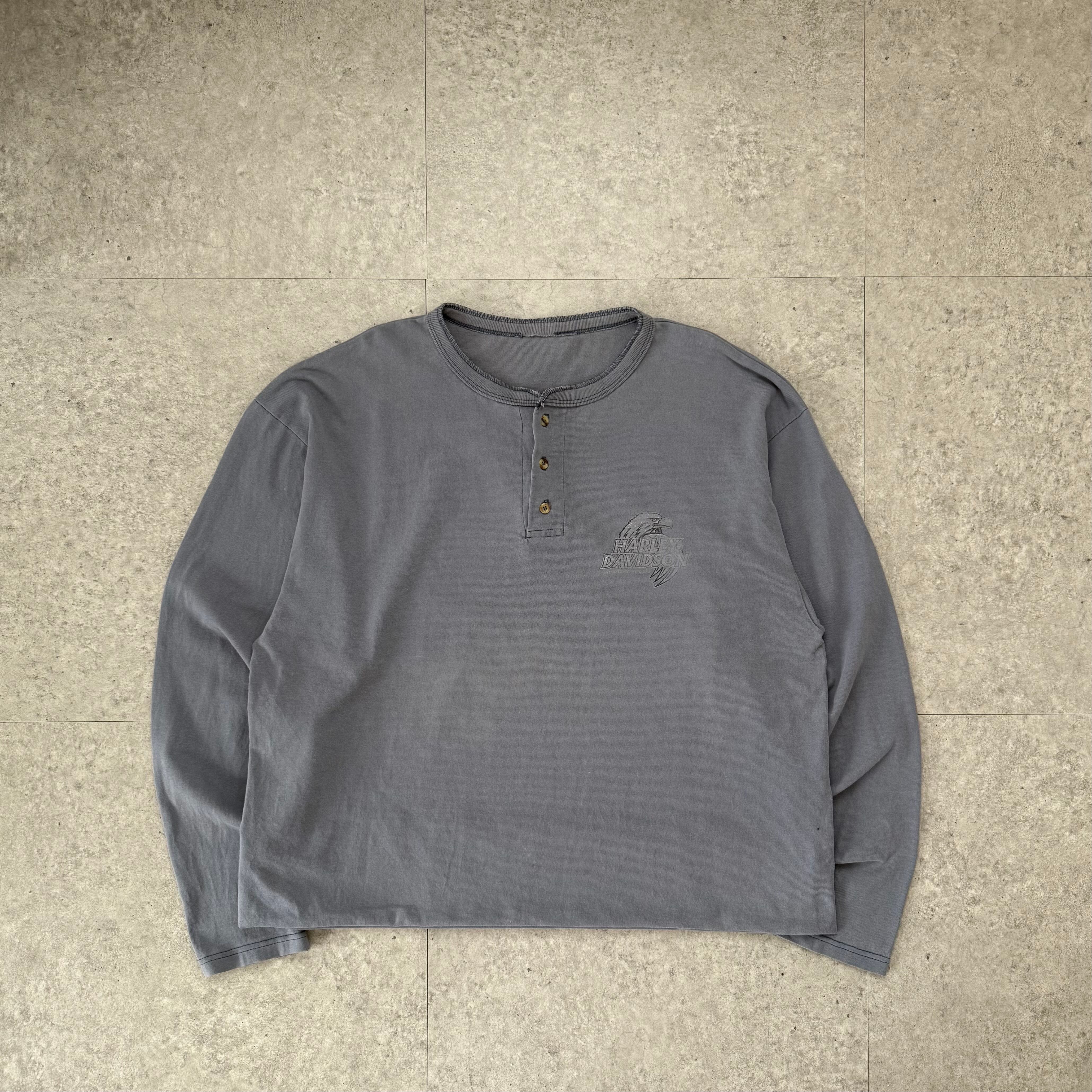 グレーブルーのヘンリーネックが印象的なハーレーダビッドソンのカットソー。無地ながらも表情豊かな生地感で、首元のボタンディテールがほどよい抜け感を演出。淡いトーンが特徴のため、デニムの経年変化をより際立たせるバランスに仕上がっています。