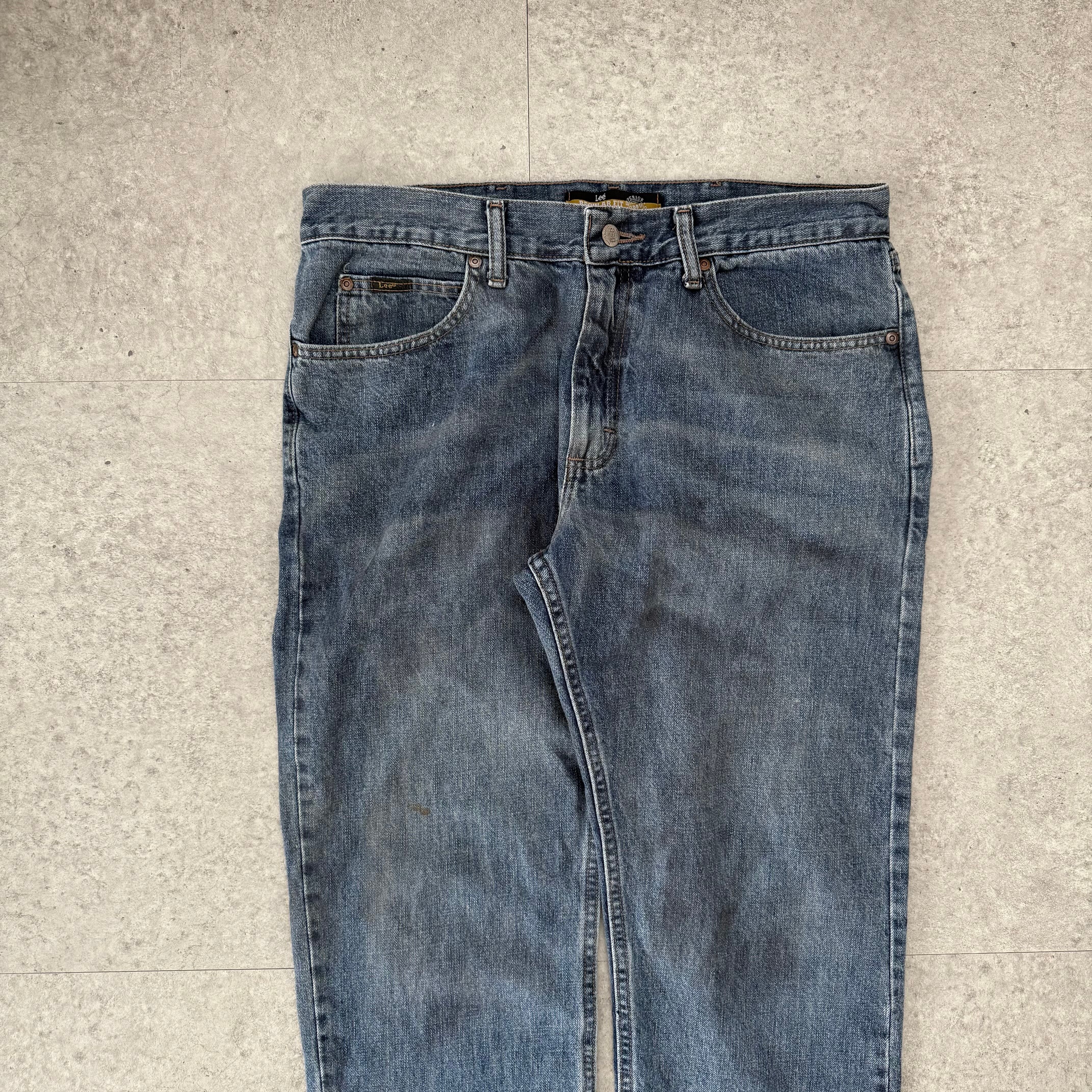 パンツは太めのデニム。色落ちしたインディゴとナチュラルな汚れが特徴で、無骨ながらも清潔感のあるブルーのグラデーションが魅力。古着らしい使用感を残しつつも、現代のスタイルにしっかりハマる一本。