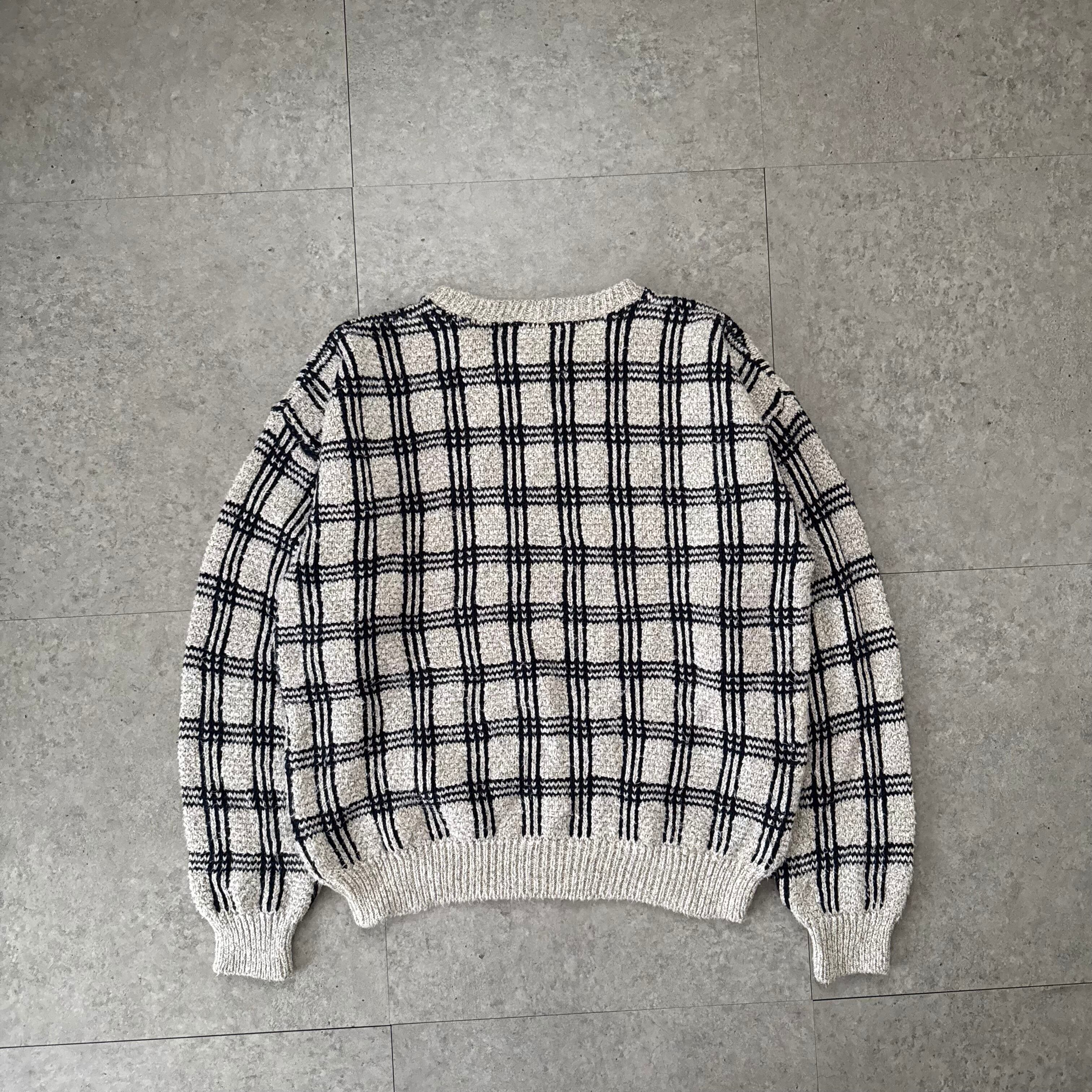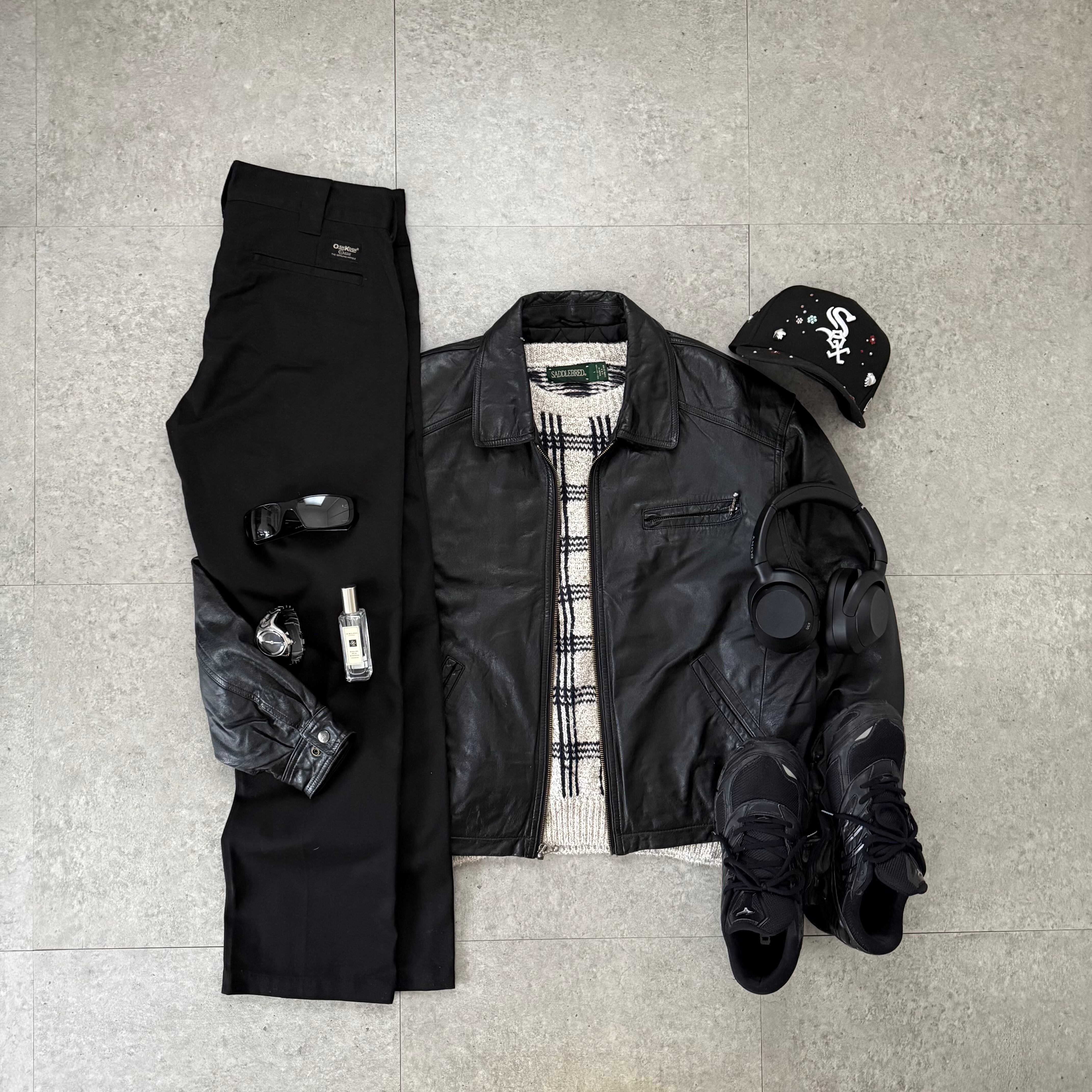 ブラックレザーを基調としたクールなトーンのセットアップ。ヴィンテージ特有の艶感をもつレザージャケットは、程よいハリとシワ感があり、無骨ながらも上品に仕上がった1枚。無駄のないミニマルなデザインで、モードにもストリートにも振れる万能さが魅力。インナーにはアイボリー×ブラックのチェックニットを合わせ、全体に奥行きをプラス。柔らかい質感とパターンの立体感がレザーの質感を引き立て、コントラストのある都会的な印象を演出します。