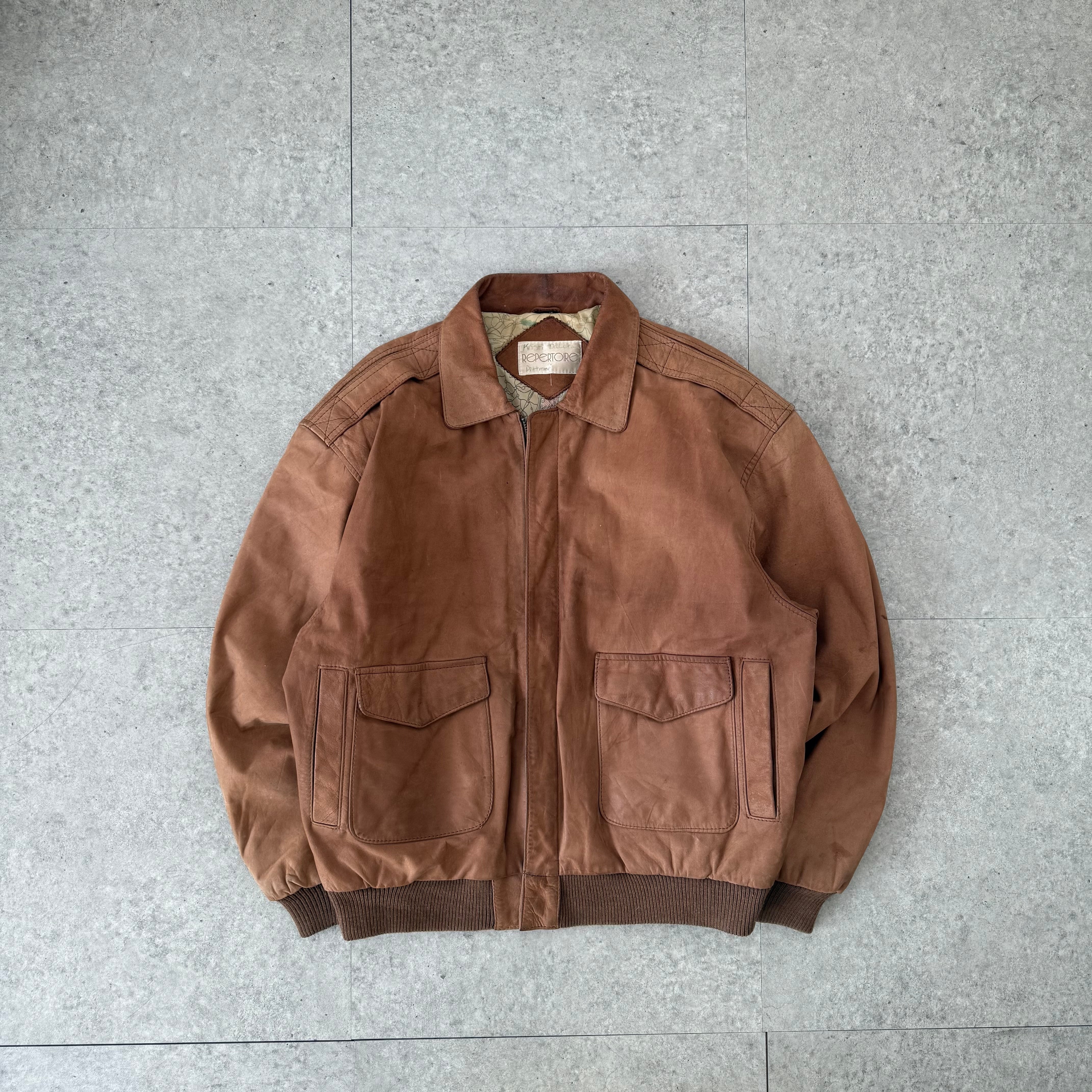 ジャケットはヴィンテージの深みを持つブラウンレザーで、裏地には地図柄の総プリントを採用。内側まで遊び心あるデザインで、着るたびに表情が増す1着。しっかりとしたリブや大きめのフラップポケットが特徴で、90’sライクなムードを漂わせながらも、都会的な印象にまとめている。