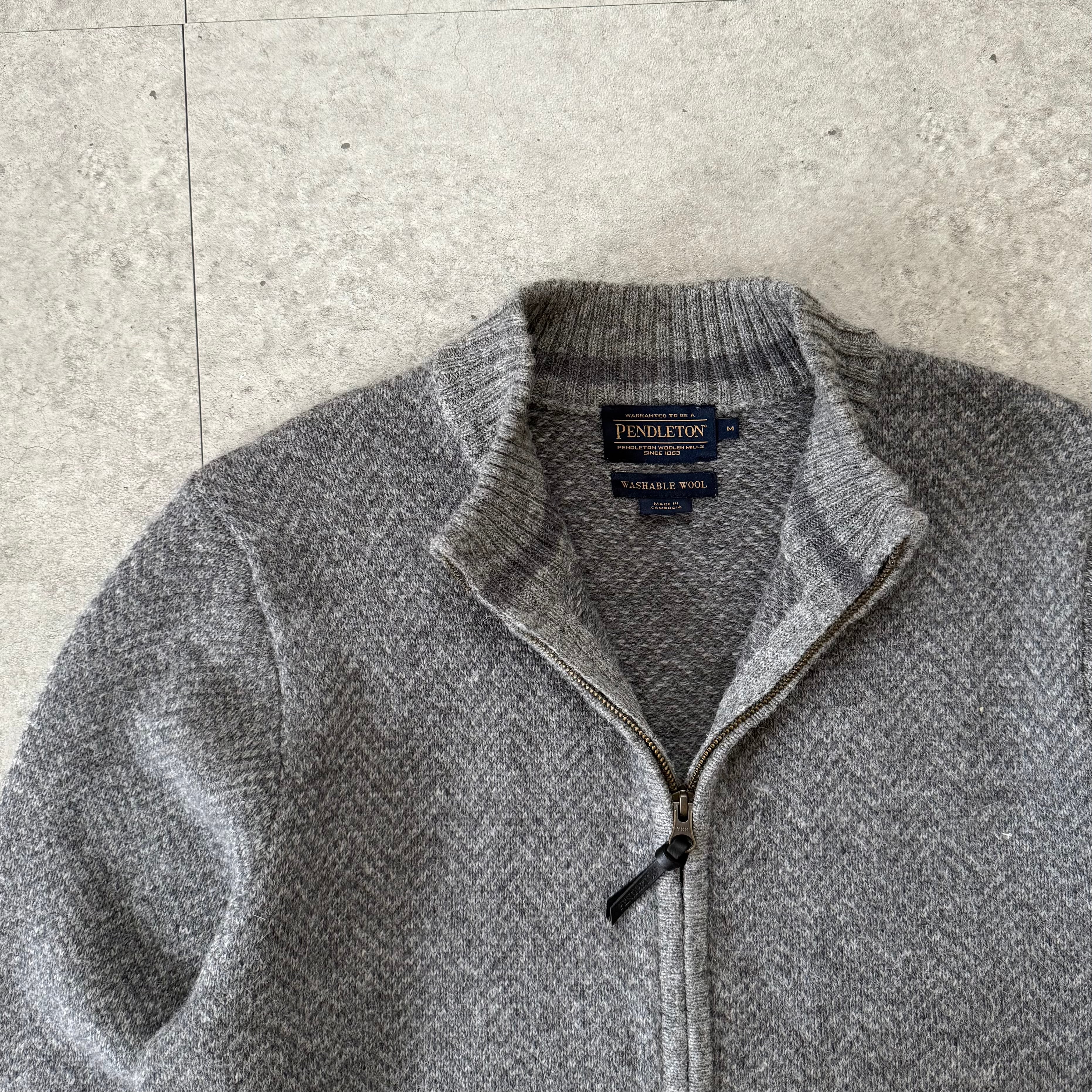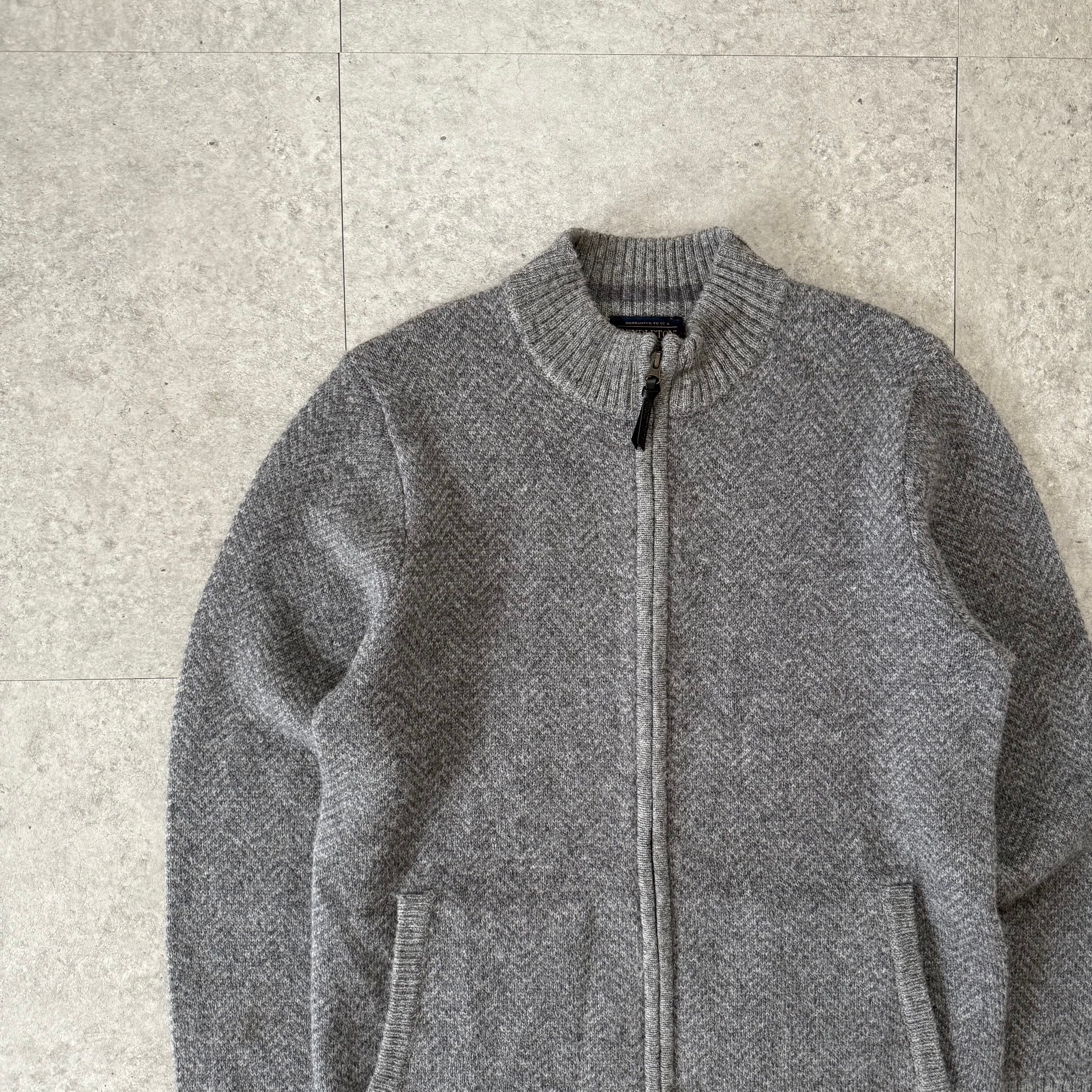 落ち着いたグレーのヘリンボーン柄が上品さを演出するジップニット。ふっくらとしたウール地で柔らかく、ミドルゲージの程よい厚みが“抜けつつも高級感”のある雰囲気に仕上げています。首元はやや立ち上がるリブ仕様で、アウターライクにも使える万能ニット。無地ながら表情のある織りで、カモ柄やワークパンツとも相性◎。