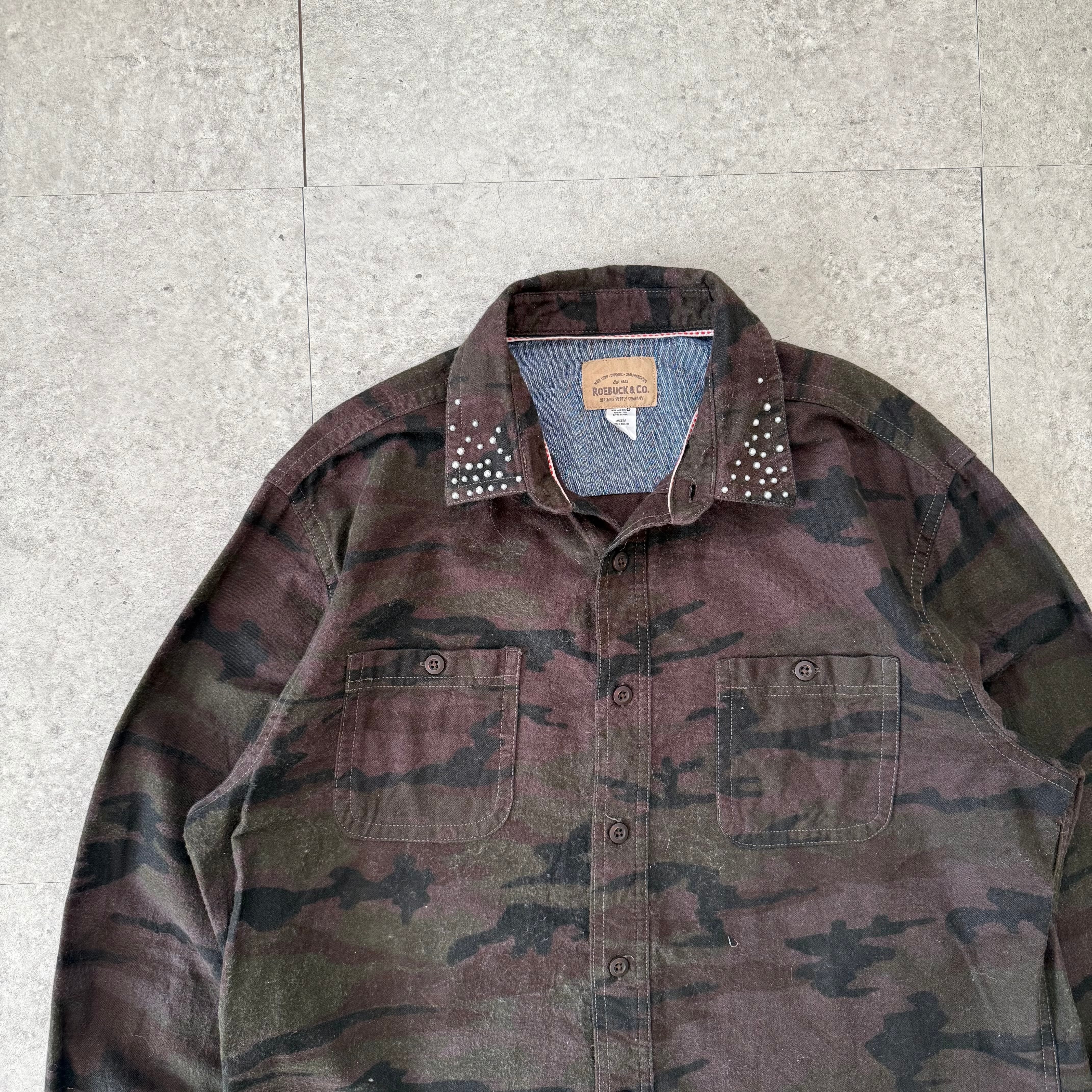 中に合わせたシャツは、深いブラウン×カーキの迷彩柄にパール入りの襟が映える1着。ミリタリーと上品さのエッセンスがミックスされたデザインで、レザーの男臭さを程よく調和してくれるアイテム。落ち着いた色味なので、派手さより“渋さ”が際立つ大人のカモ柄アイテムです。