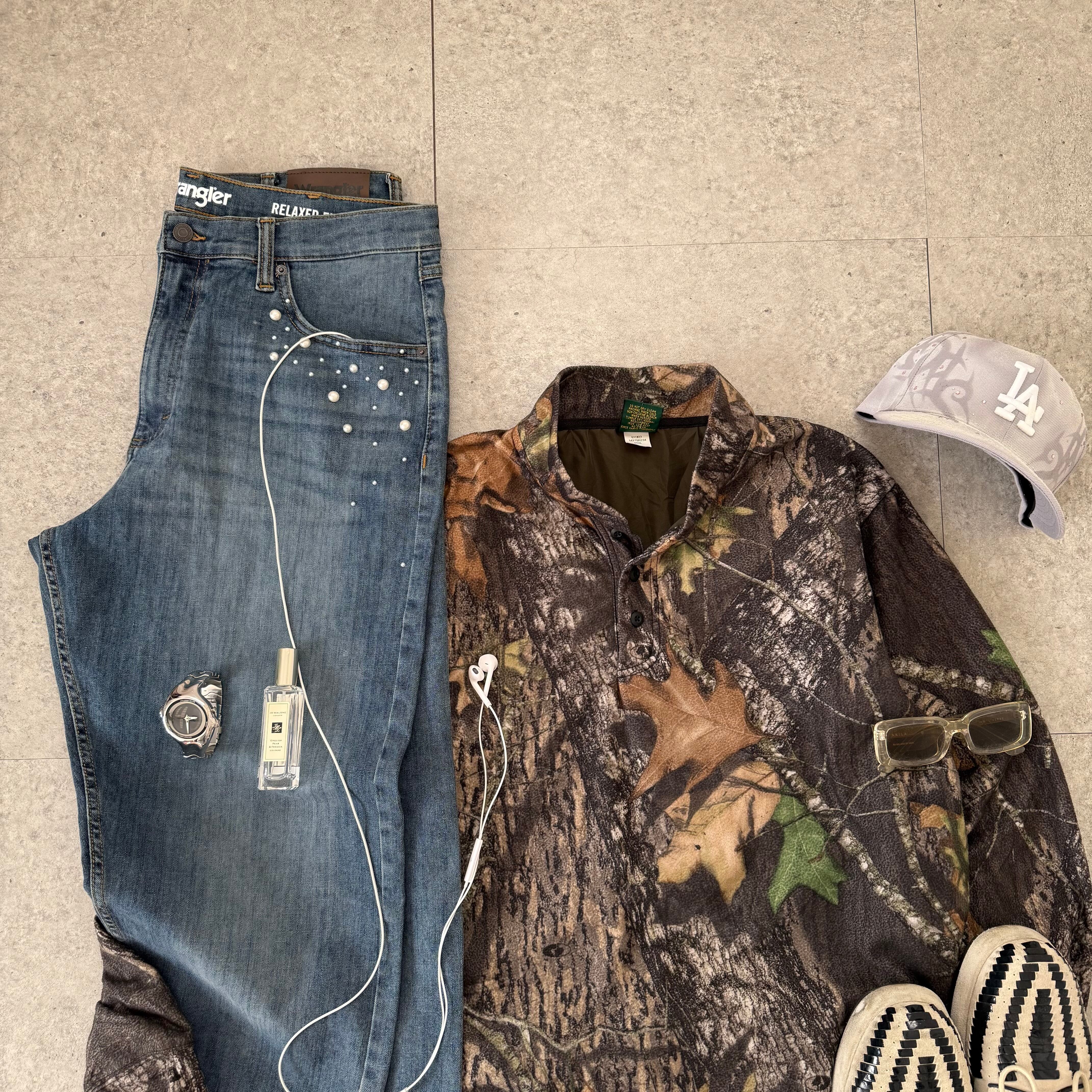 パンツはWranglerをベースに、フロントに散りばめたパール加工がアクセント。淡めのブルーにホワイトパールがメリハリ良く浮き上がり、リアルツリーの重たい色味を軽く中和してくれます。シルエットは太めのストレートで、ロールアップしても野暮ったくならない万能デニム。トップスの個性を活かしつつ、スタイリングに洒落感をプラスしてくれる一本です。