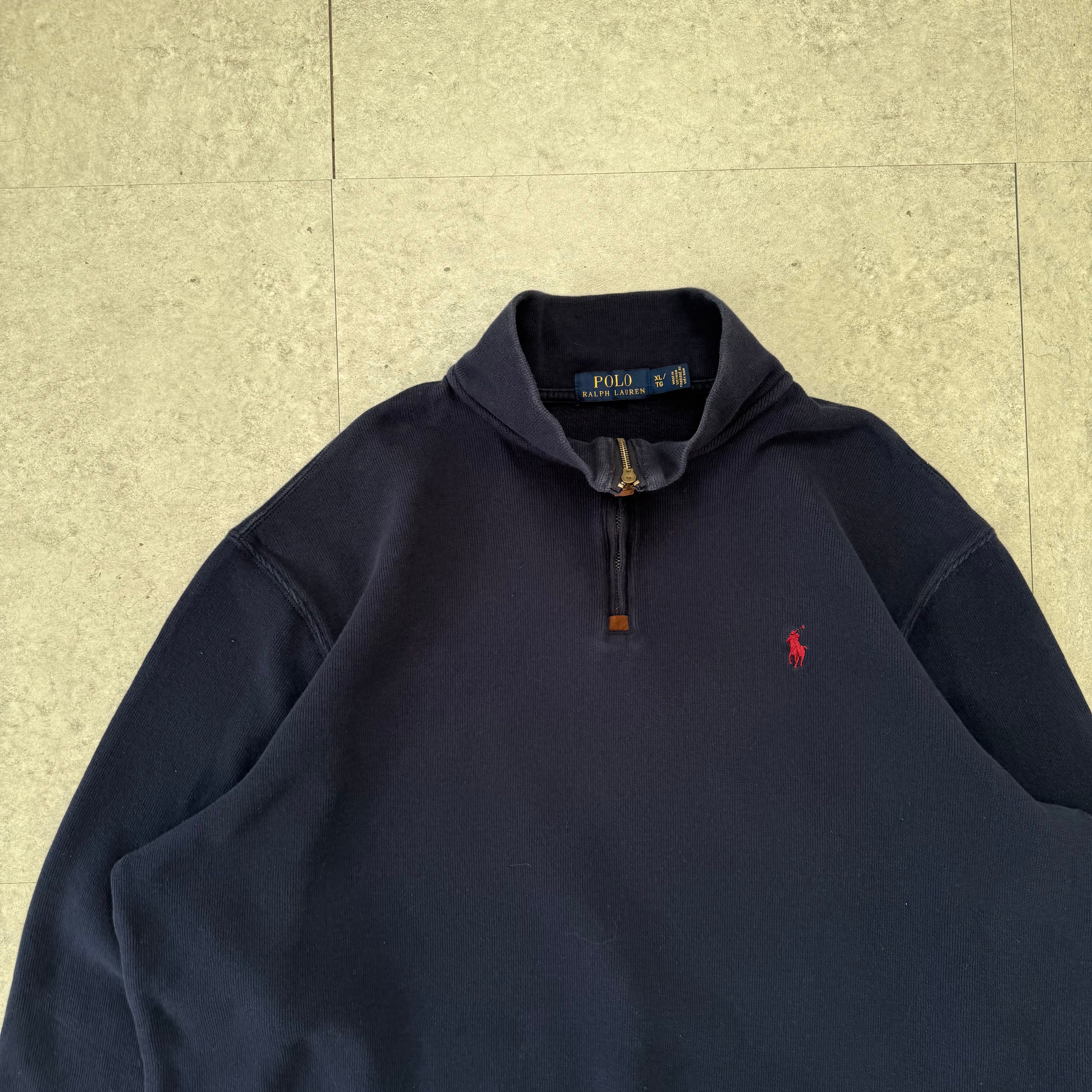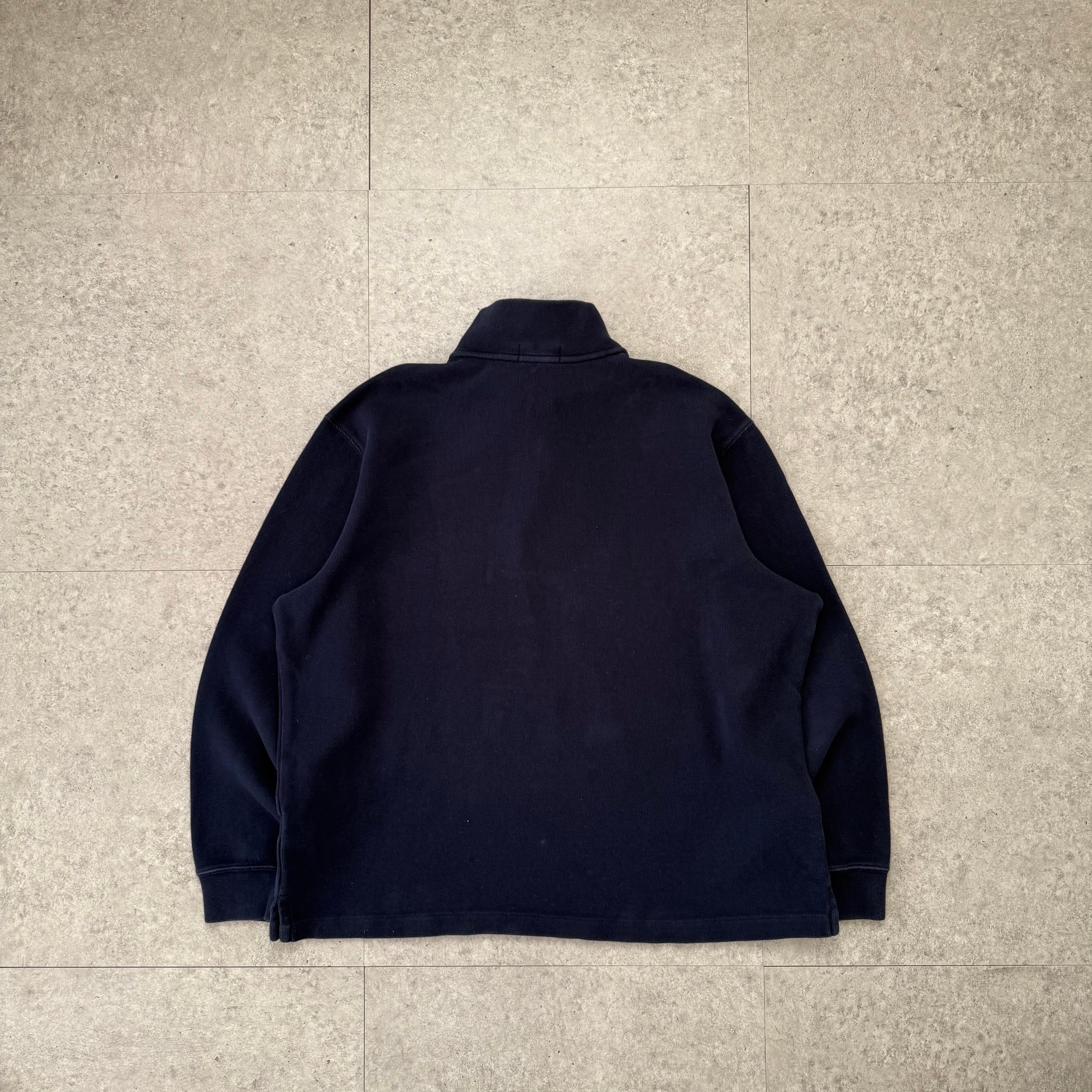 ダークネイビーに赤ポニーのワンポイント刺繍が映えるPOLOのハーフジップ。古着ならではの風合いが魅力で、全体のシルエットはゆったりしながらも短丈気味で今のストリートにハマる形。ハーフジップの抜け感が、キャップ・革靴・ヘッドホンなど上品な小物とも相性抜群。