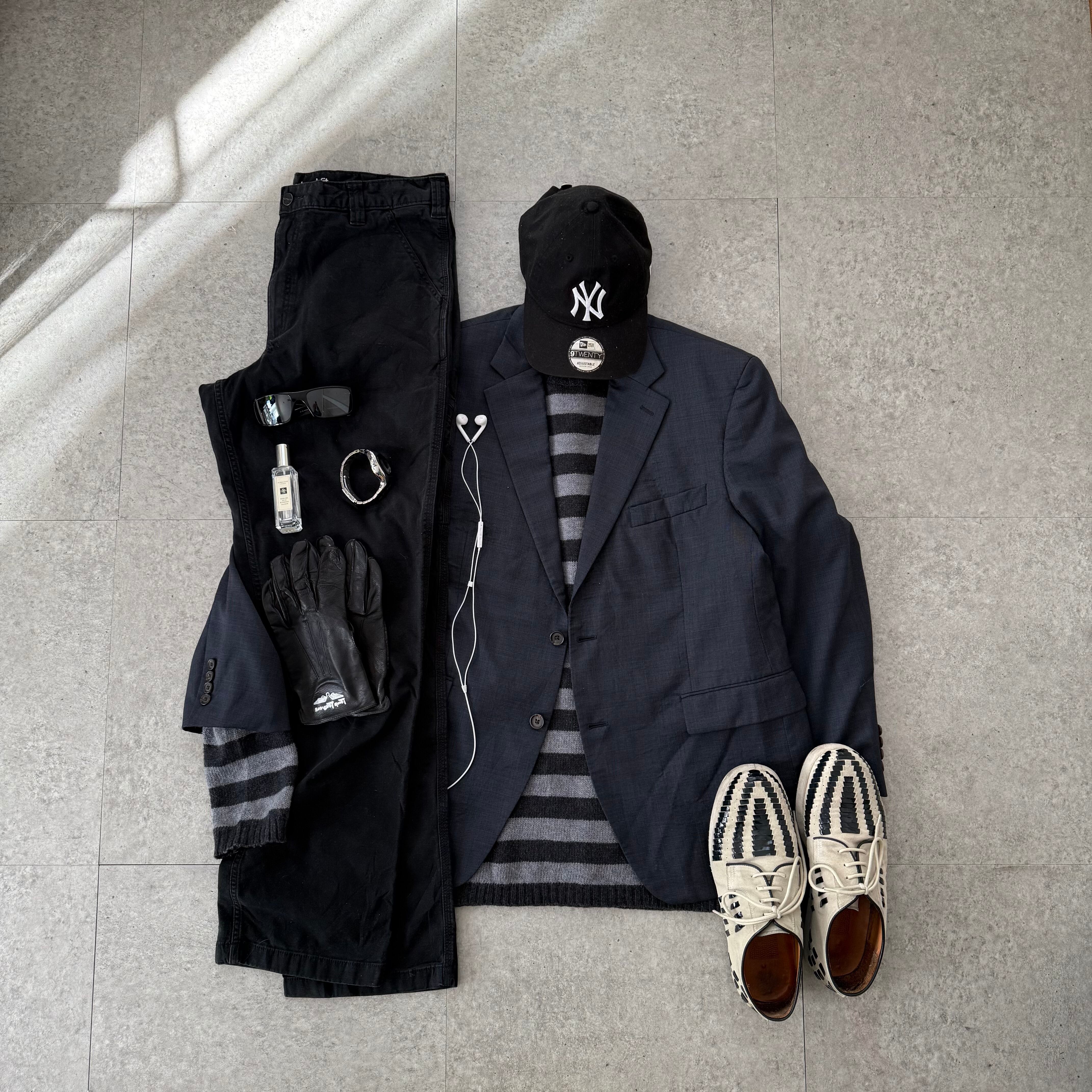ネイビーのテーラードジャケットは、かっちりしすぎない素材感と程よい肩の落ち感が魅力。短丈仕様にすることで、クラシックなアイテムをストリートに引き寄せたバランスに仕上げています。インナーのボーダーニットが程よく抜け感を作り、重くなりすぎない印象に。