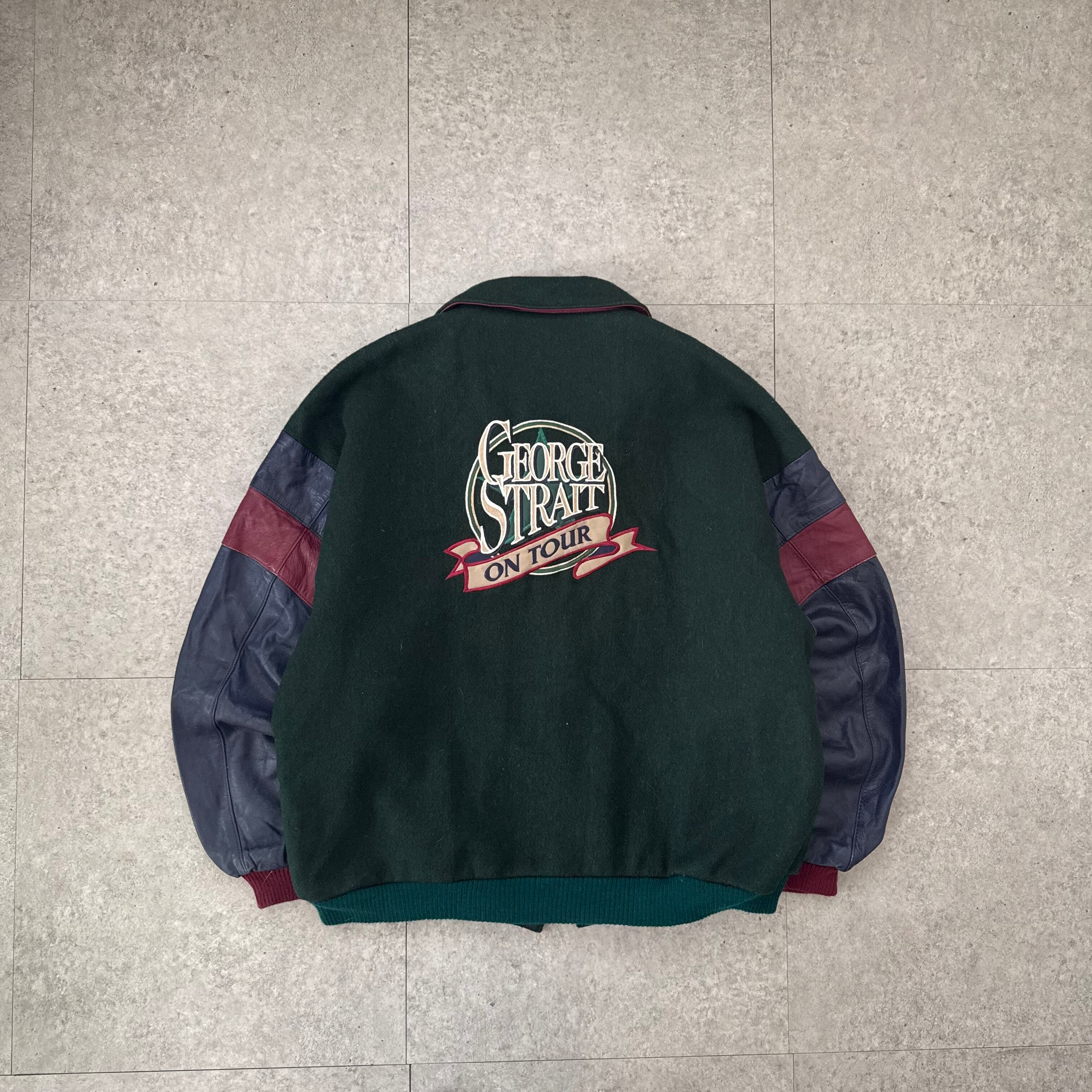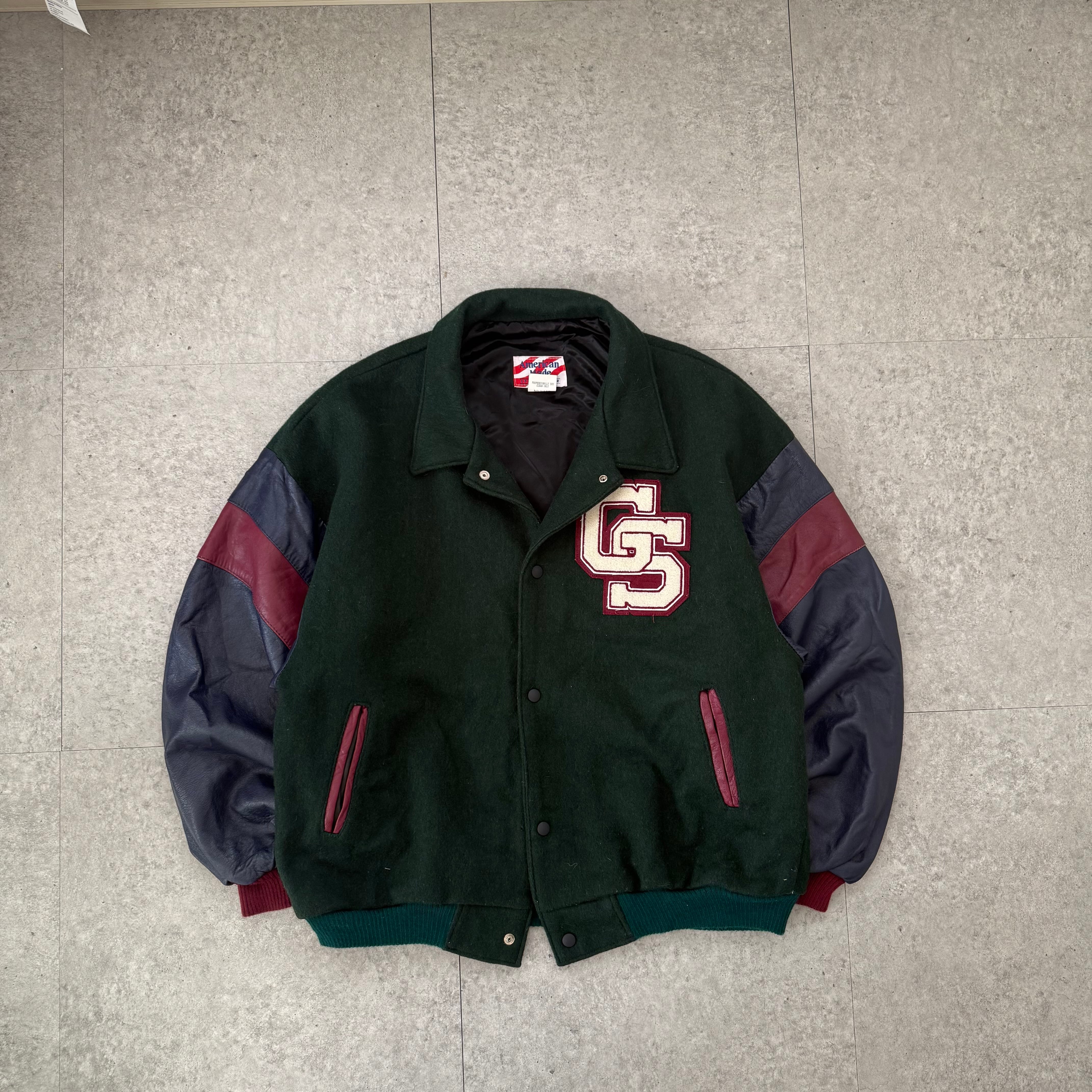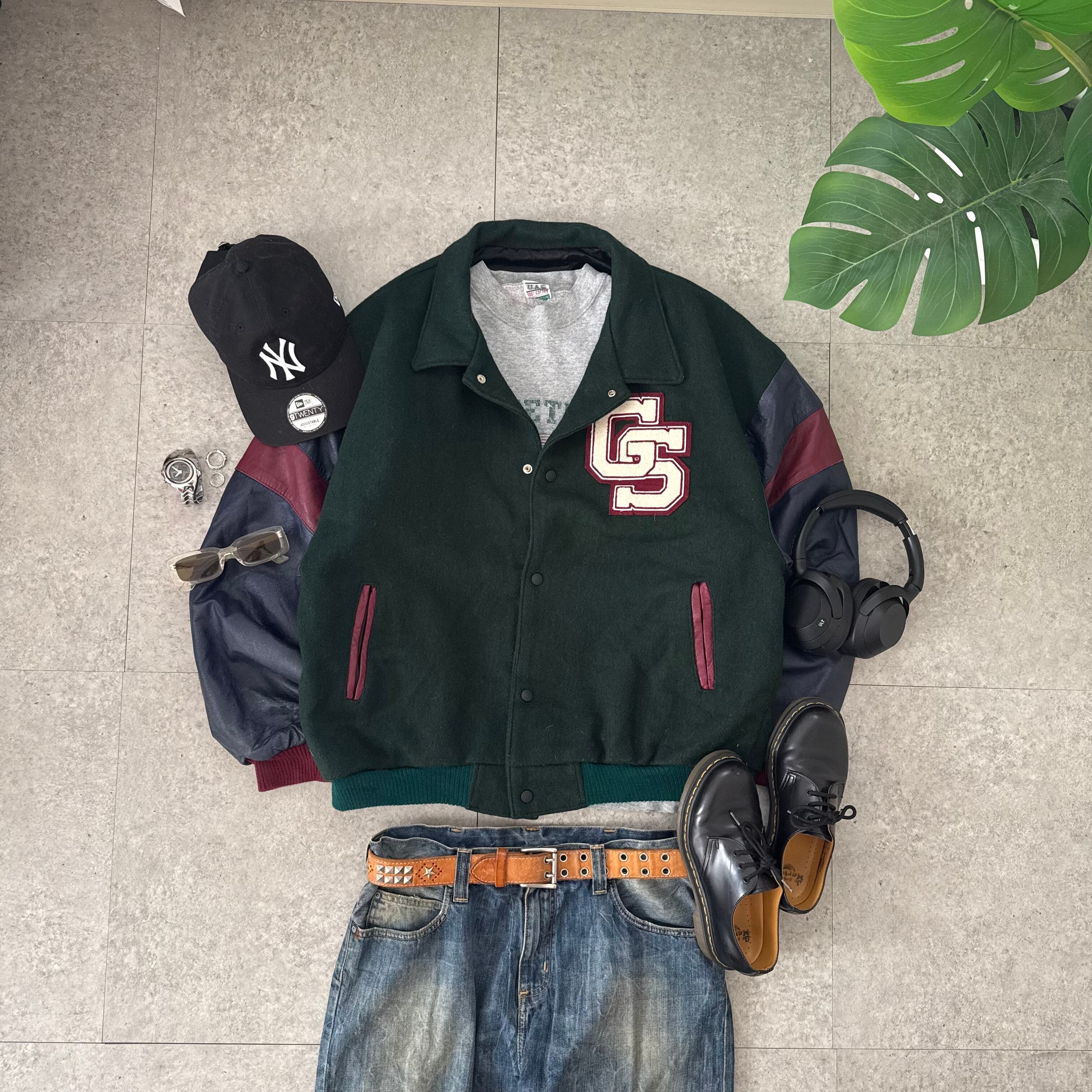 深みのあるグリーンのウールボディに、ネイビー×ボルドー配色のレザースリーブを組み合わせた存在感のあるスタジャン。フロントの「GS」ワッペンがしっかり主張しつつ、背面にはツアー調のグラフィックが入ることで、ただのカレッジ物では終わらない一点。身幅広め・着丈やや短めのバランスで、オーバーサイズ気味に着ると一気に今っぽいシルエットになります。