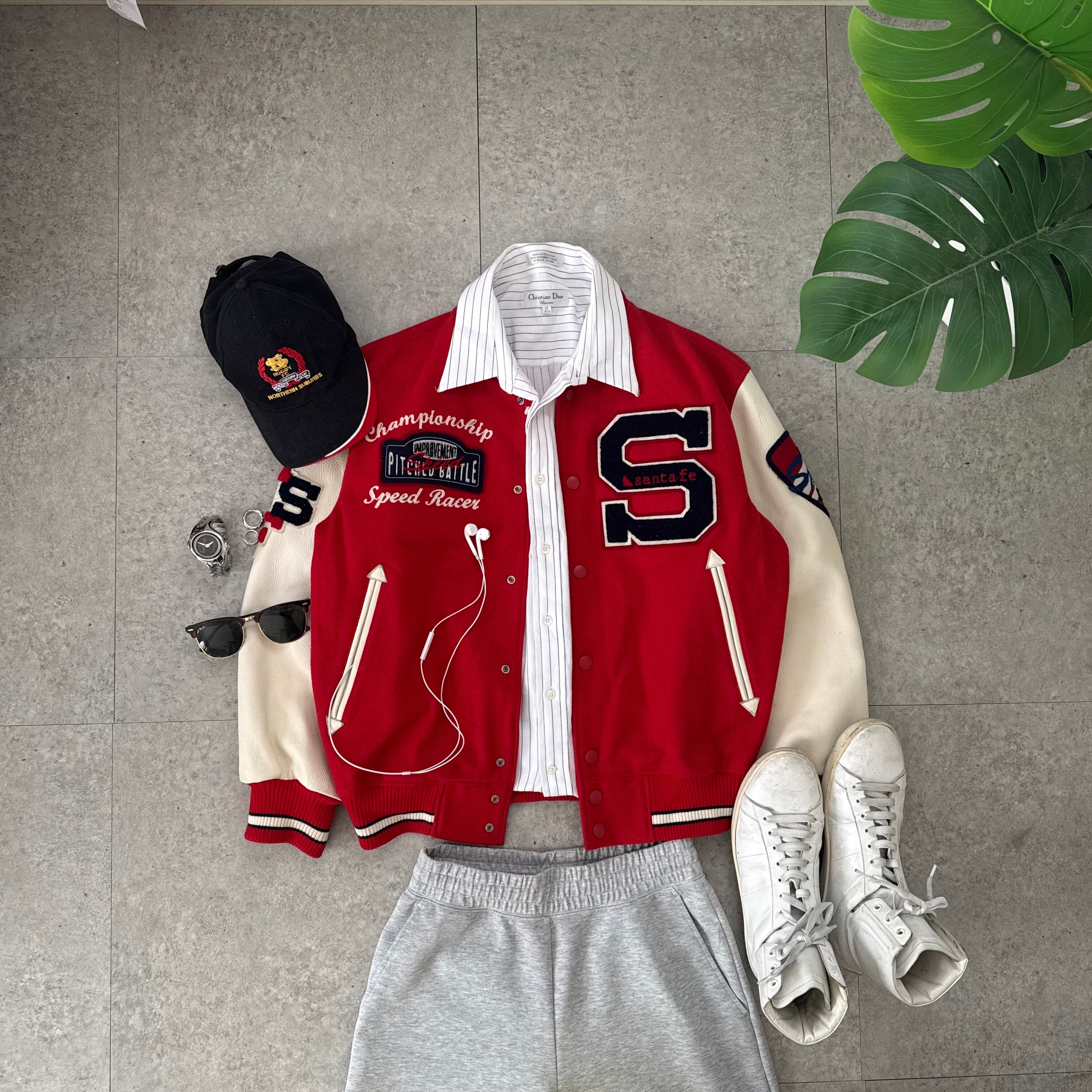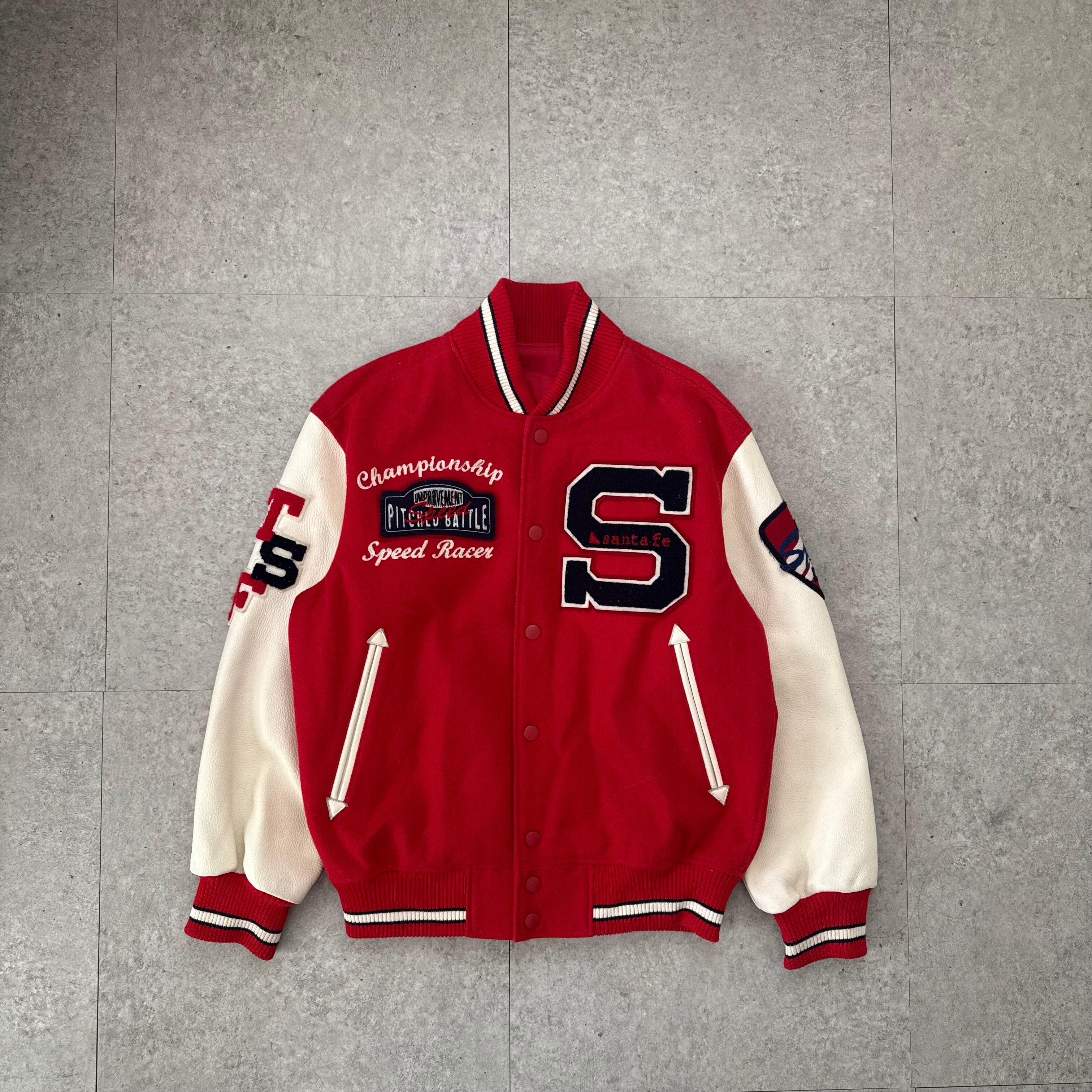 レッド×アイボリーの配色が目を引くバーシティジャケット。フロント・バックともにワッペンや刺繍が多く入るデザインながら、色数が抑えられているため派手になりすぎず、ストリートにもクラシックにもハマる一着。身幅はしっかり取られている一方で着丈はやや短めで、L表記ながら着用時はコンパクト寄りなバランス。インナーを見せるレイヤード前提で着たいシルエット。