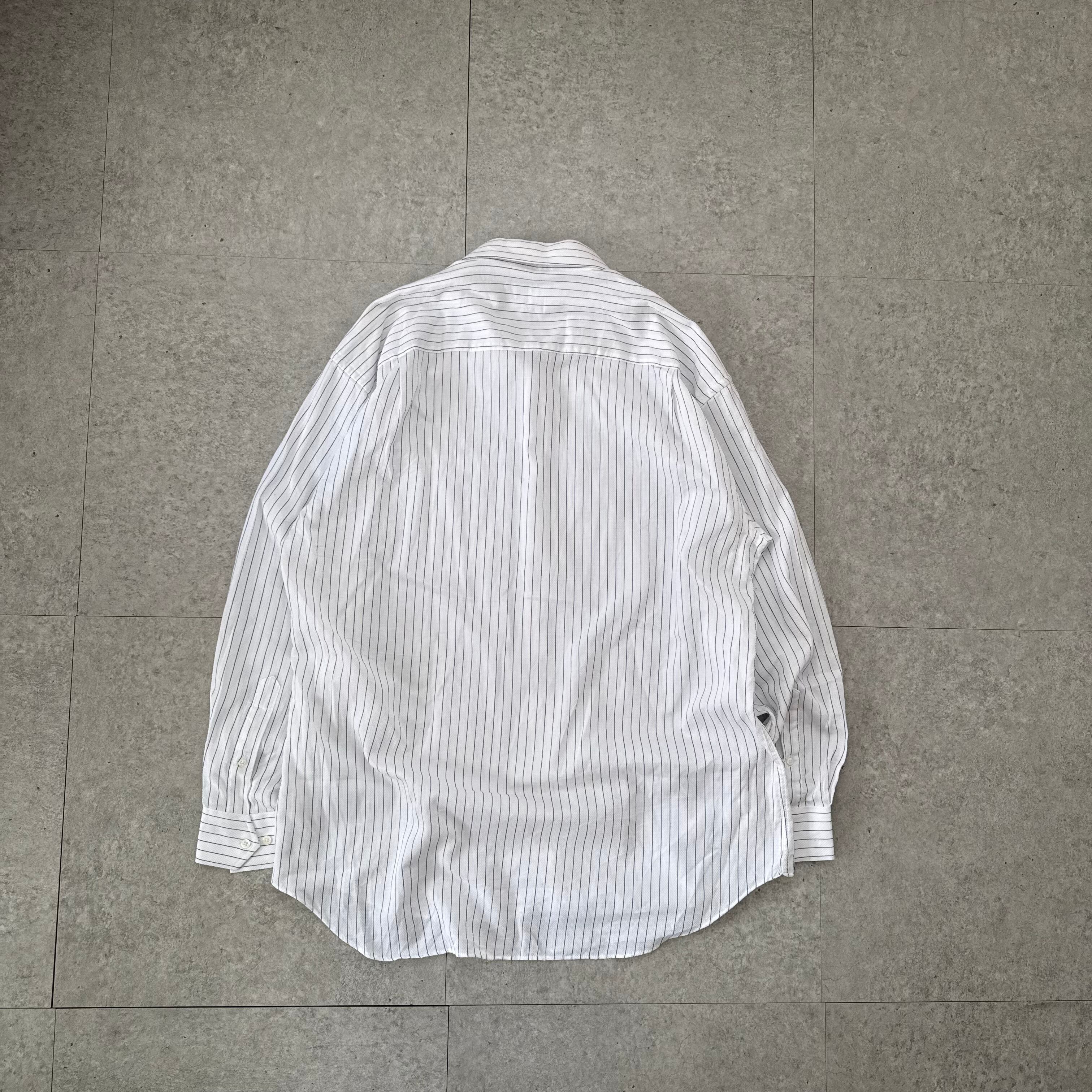 Christian Diorのホワイト×細ストライプシャツ。ドレス寄りの上質な生地感だが、身幅と肩周りにゆとりがあり、堅くなりすぎないサイズ感。スタジャンの中に着た際、襟や裾が自然に主張し、コーデ全体を引き締めてくれる。タイトさはなく、体感はリラックス寄り。