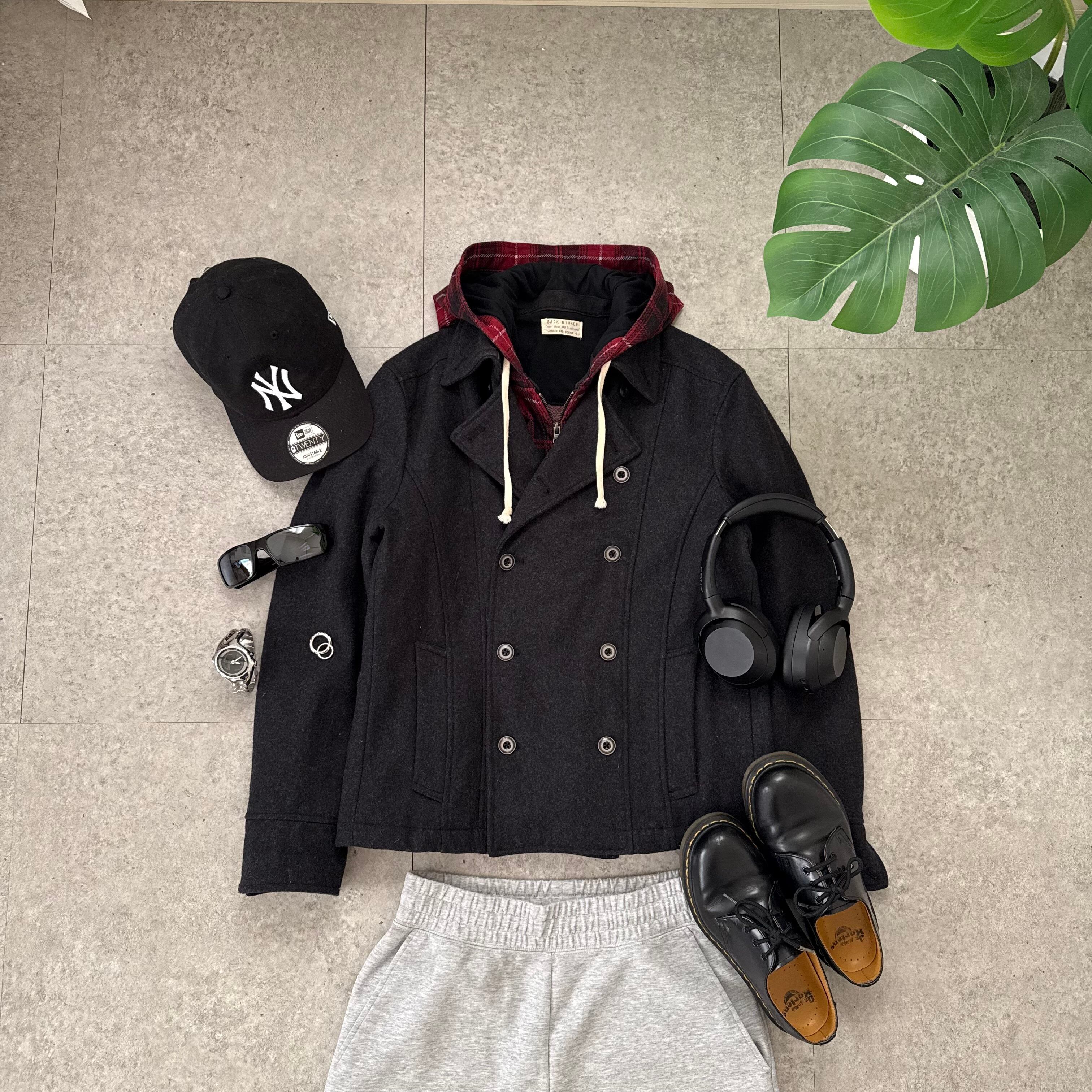 重厚感のあるブラックPコートを主役に、インナーでカジュアルダウンしたスタイリング。