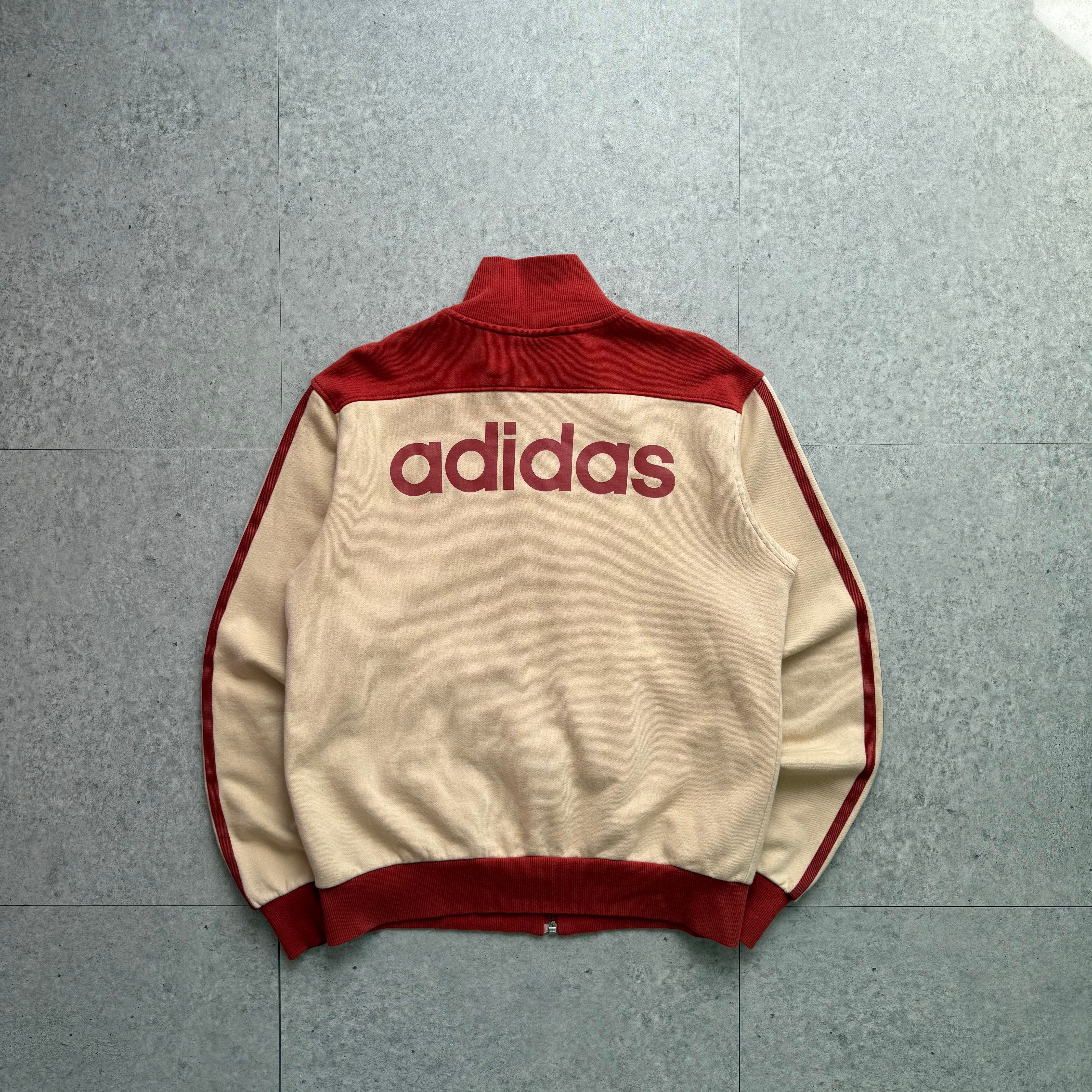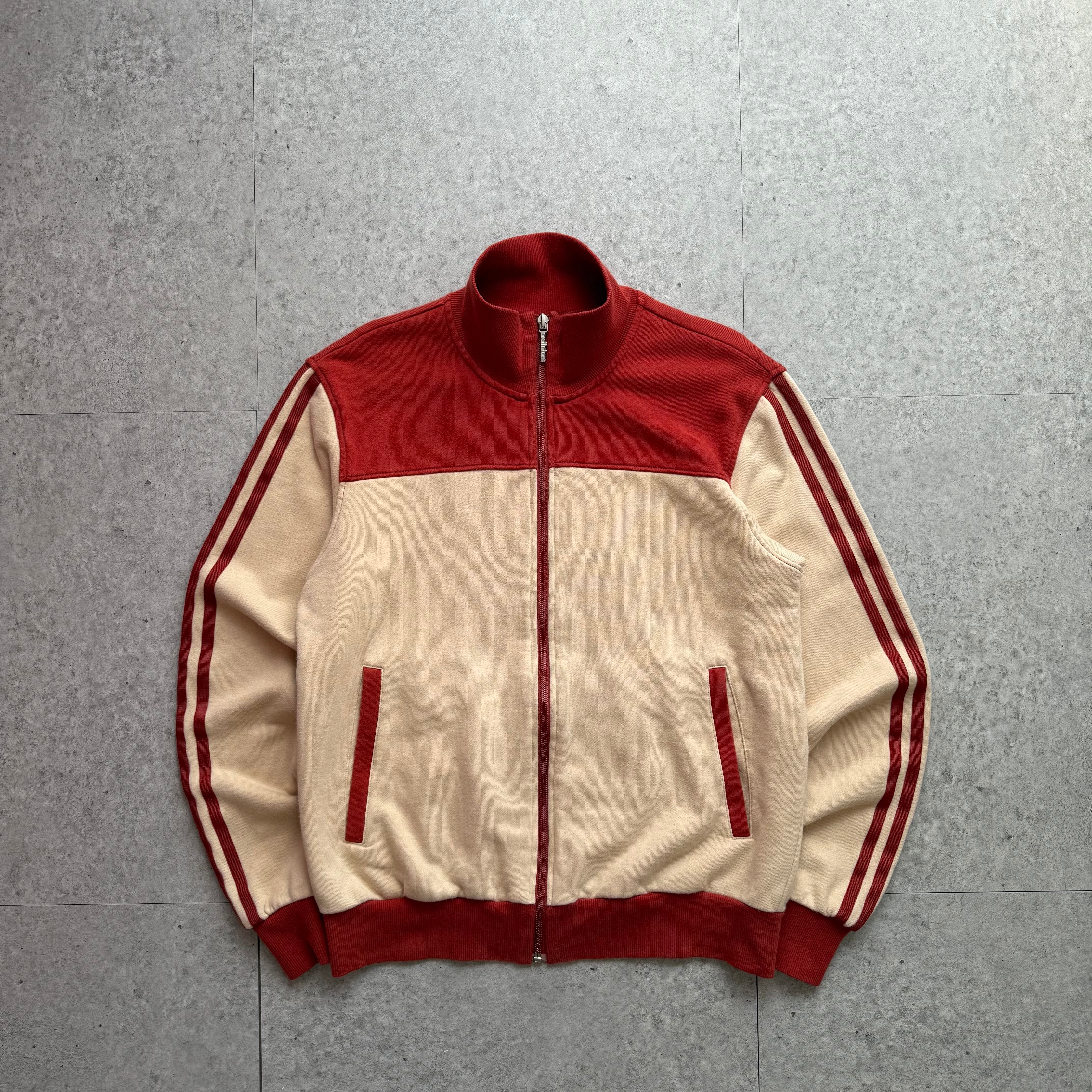 adidasのトラックジャケットを主役に、王道ストリートを意識したクリーンなスタイリング。ベージュ×レッドの切り替え配色が特徴的で、袖のスリーストライプとバックのビッグロゴがしっかり主張する一枚。スタンドカラー仕様で、ジップを上げればスポーティに、開ければ抜け感のある着こなしが可能。短丈寄りのバランスで、太めデニムとの相性も抜群。