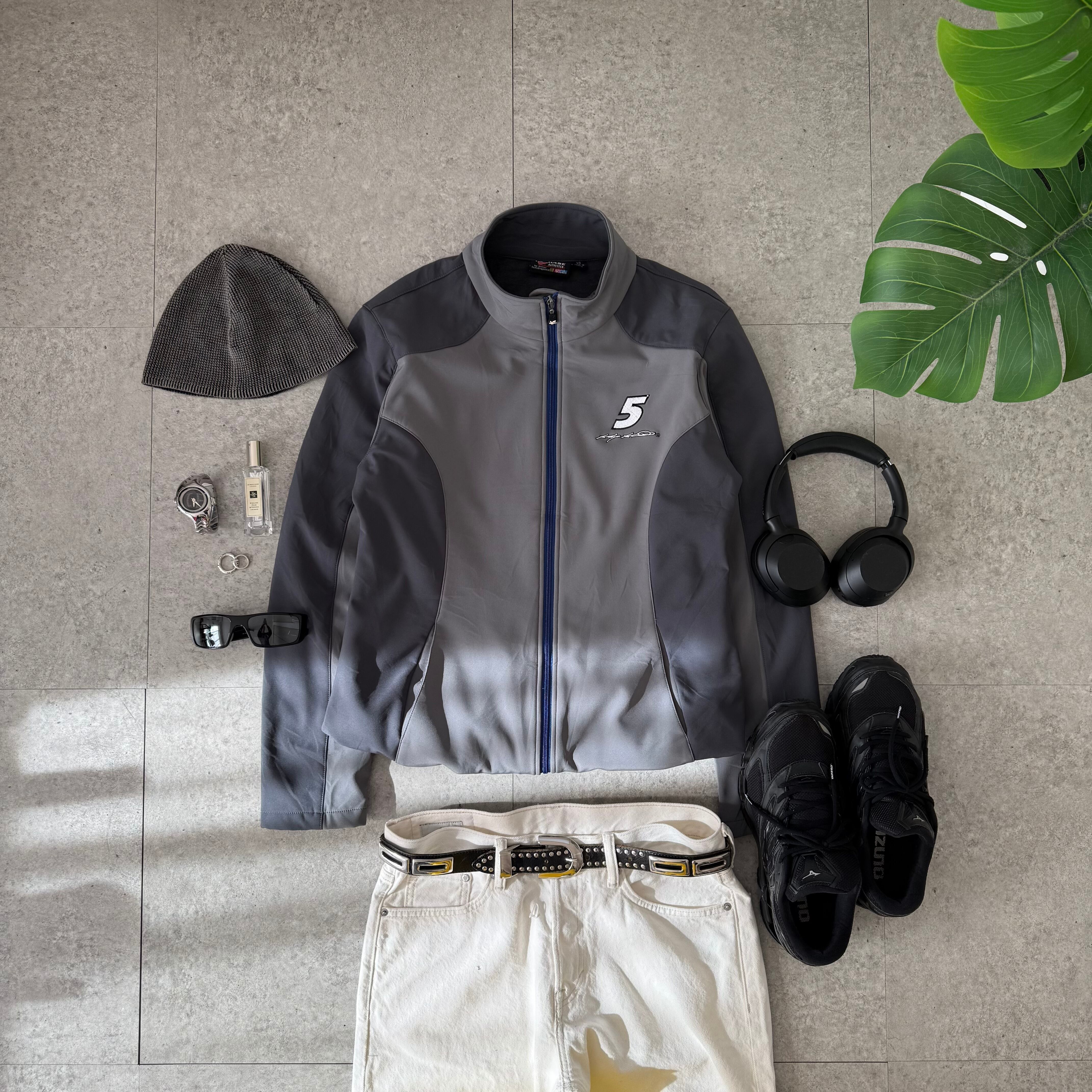 グレーとチャコールの同系色の切り替えが特徴的なジップジャケットを主役に、テック要素と都会的なムードを併せ持ったスタイリング。切り替えラインや立体的なパターンが機能服ライクな印象を与えつつ、配色を抑えることで無機質で洗練された雰囲気に仕上がっています。スポーティーすぎず、街着として成立する絶妙なバランス感が魅力の一枚です。