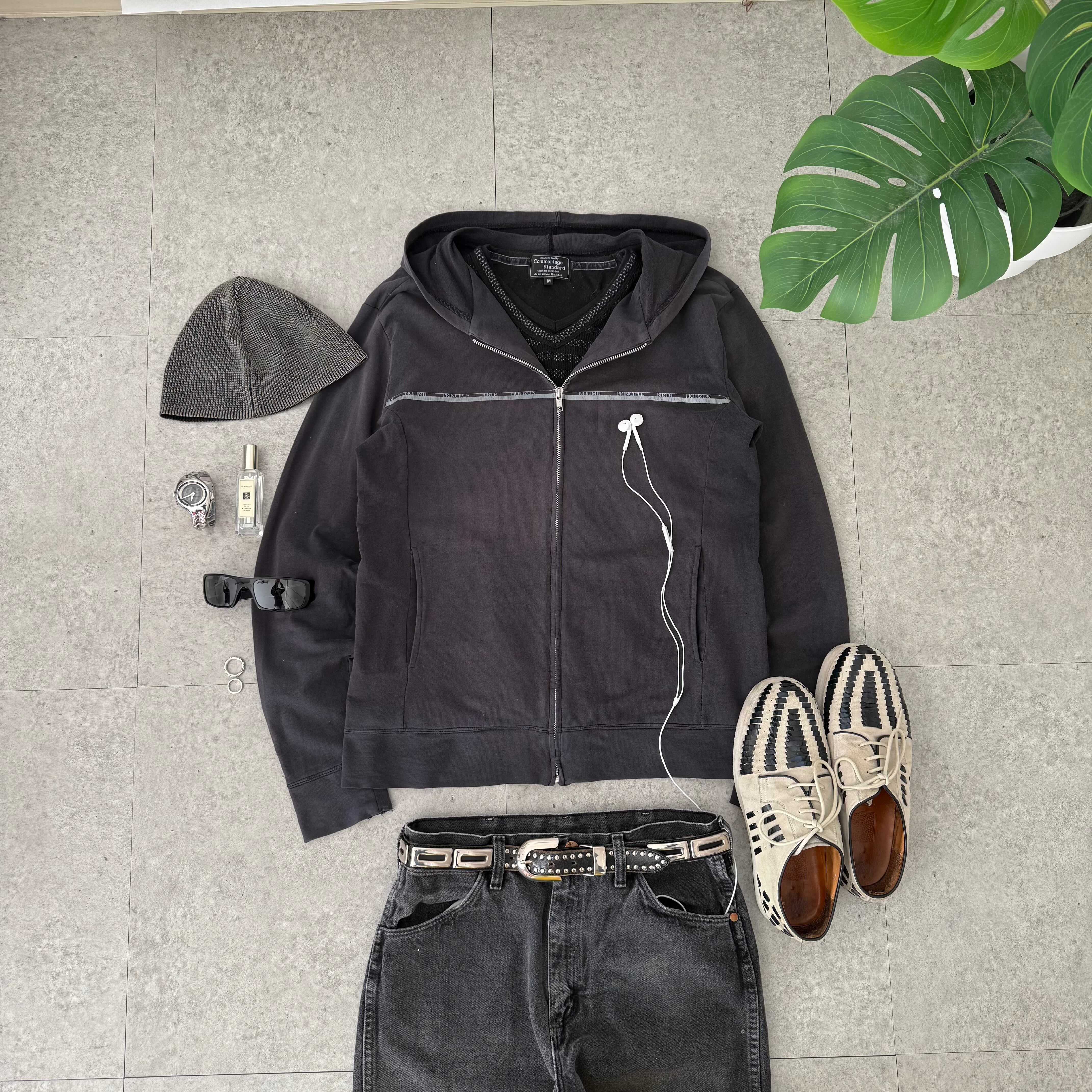 ブラックジップパーカーを軸にした、無駄のないミニマルなストリートスタイル。程よくフェードしたブラックボディが新品にはない雰囲気を出しており、シンプルながらも一枚で存在感のあるトップスです。ヘビーウェイトじゃない分インナーとのレイヤードも楽しめる万能なシルエットです。個人的にはジャストサイズでの着用がめちゃくちゃかっこいいと思います