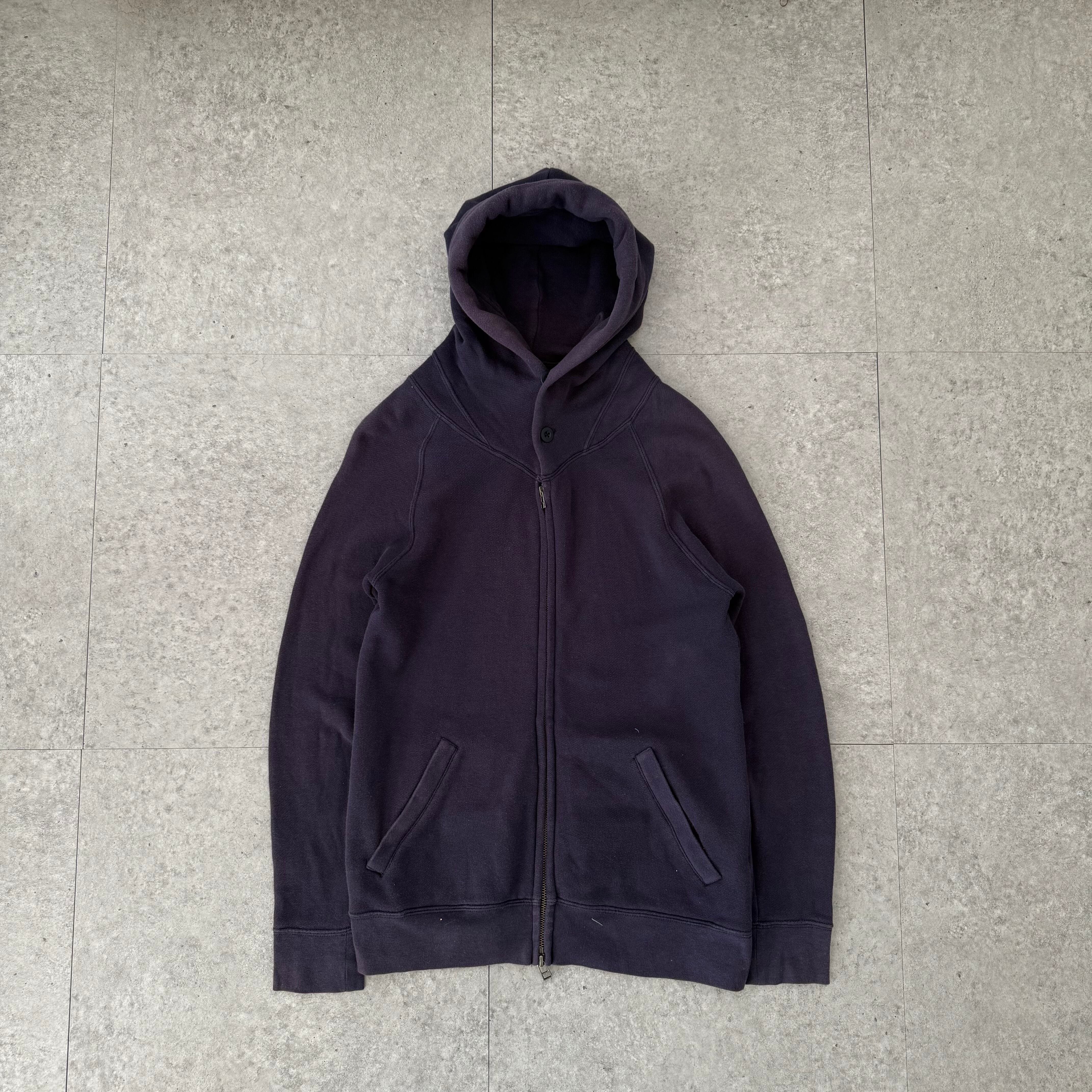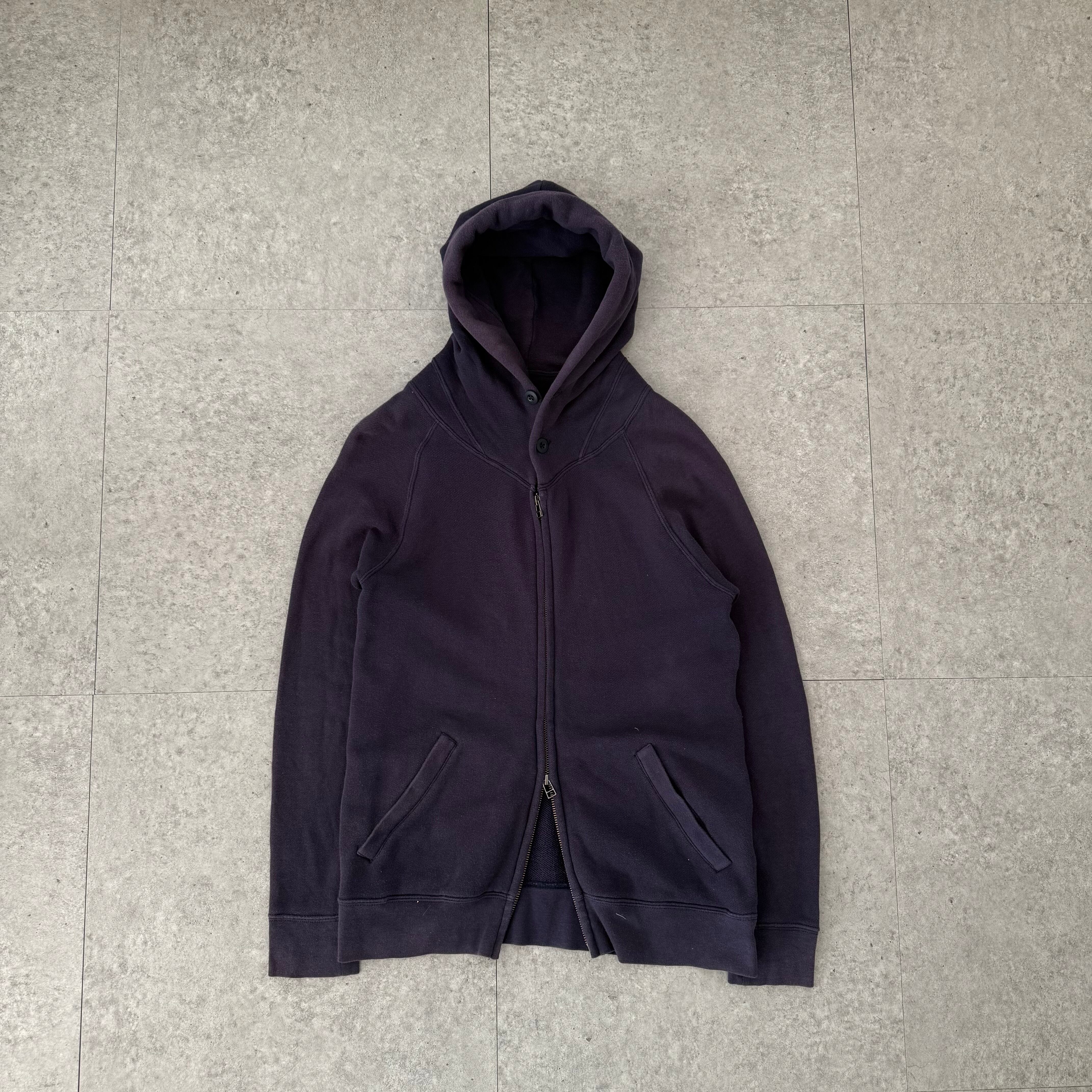 一見シンプルに見えながら、随所にディテールが詰め込まれたジップフーディを主役にしたスタイリング。ネイビーをベースに、長年着込まれたようなフェード感が非常に完成度高く出ており、色ムラや退色の表情が一点物らしい存在感を放っています。人工的に作れない、古着ならではの自然な経年変化が魅力。