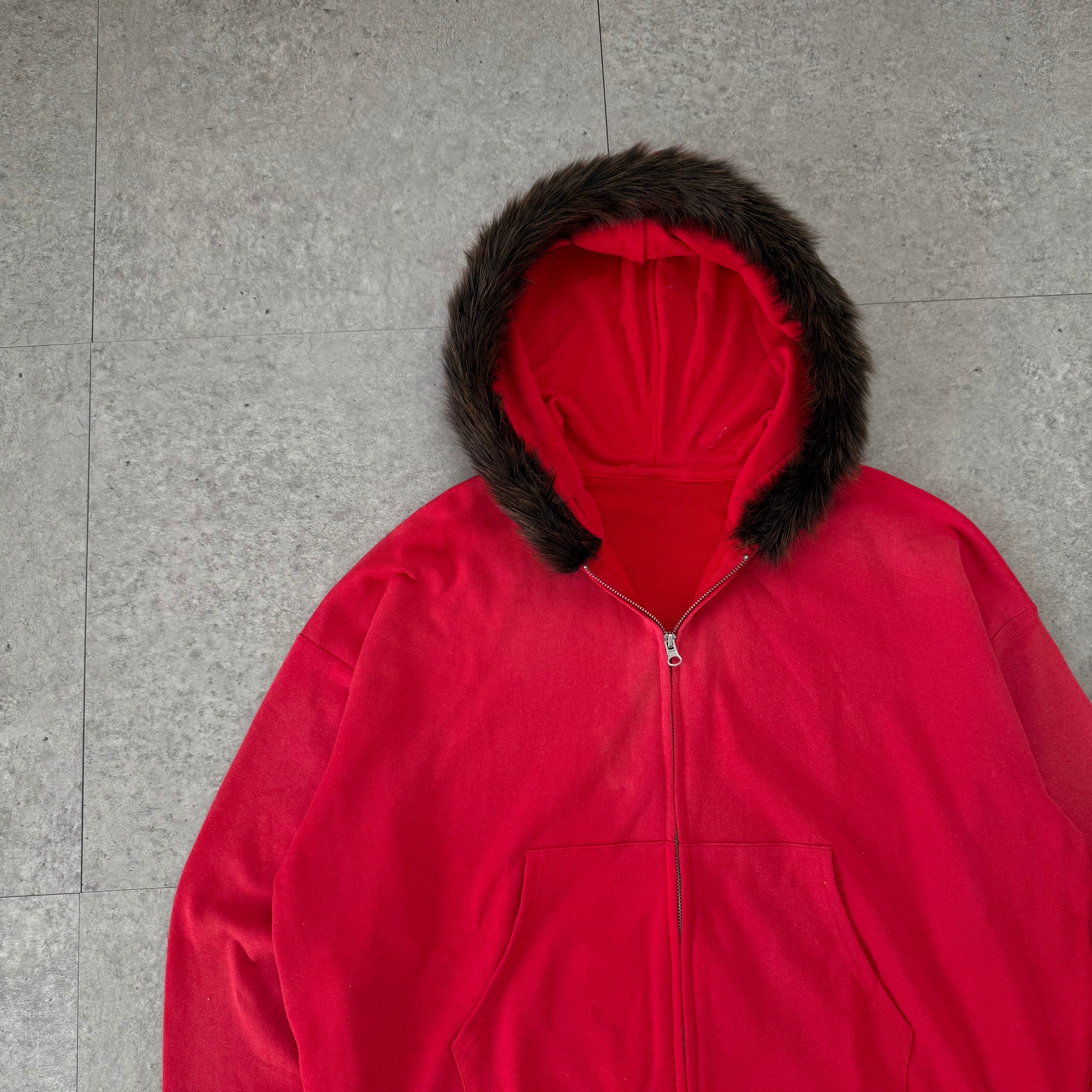 程よくフェードが進んだレッドカラーが魅力のジップパーカー。新品の赤とは違い、色が抜けたことで柔らかさと奥行きが生まれ、ヴィンテージライクな雰囲気に仕上がっている。フード周りのファーとフェードレッドの組み合わせが絶妙で、主張はあるが嫌味のないバランス感。