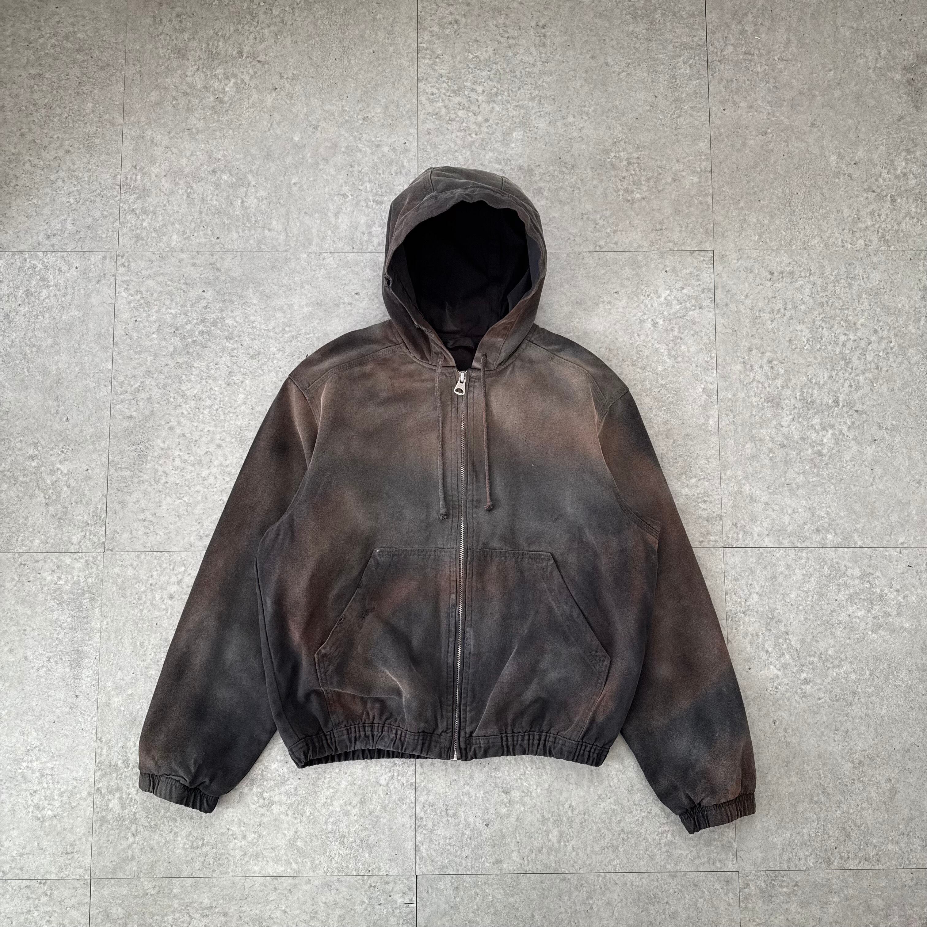 全体にムラのある色落ちが入り、単なるブラックではなく奥行きのあるフェード感が特徴。無骨さと洗練が共存した、海外ストリートを意識したスタイリング。