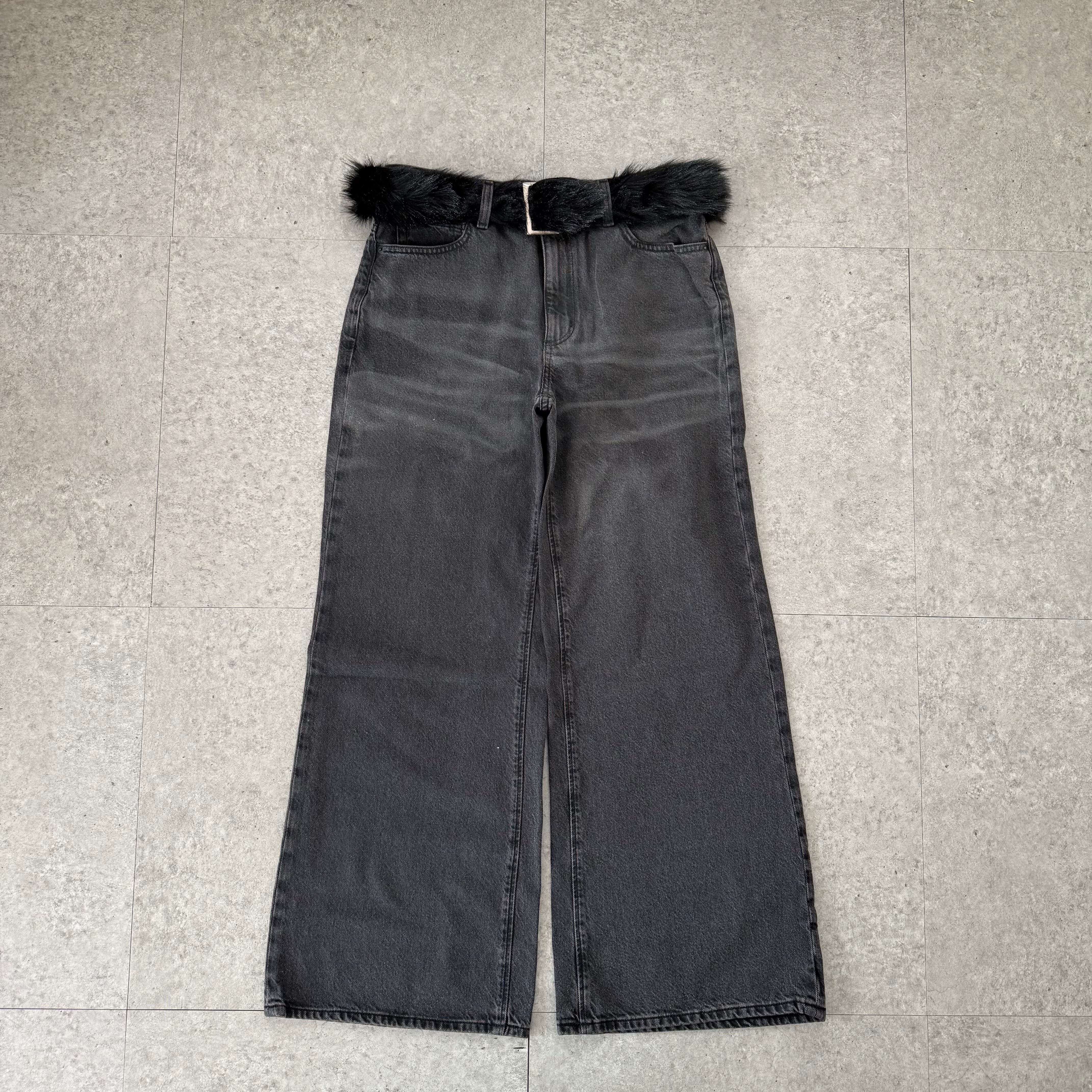 ウエストにはファー付きベルトを合わせ、無機質なブラックトーンの中にアクセントを加えている。
