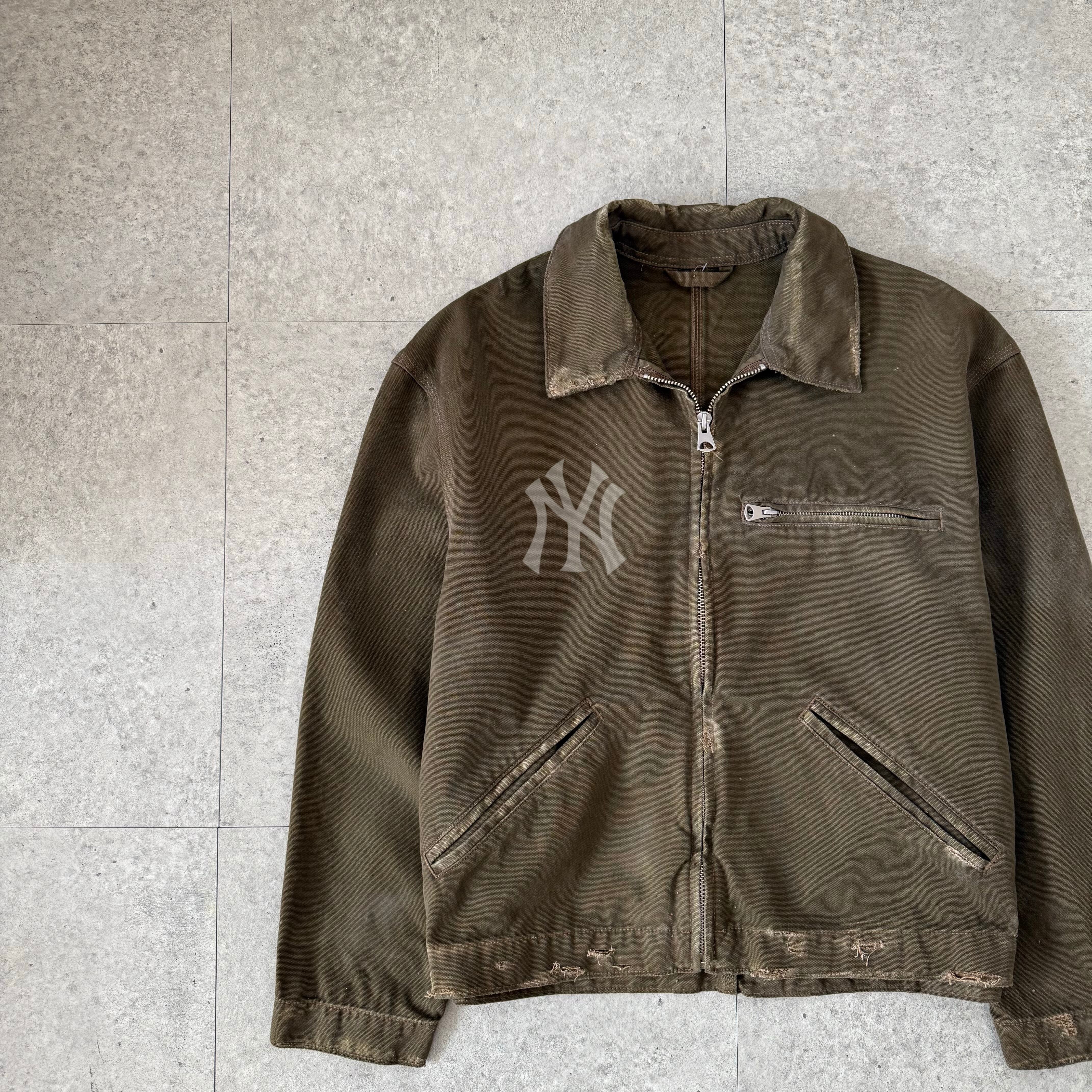 トップスはダメージや色褪せがかっこいいワークジャケット。胸元のNYロゴは同系色で控えめに配置されており、主張しすぎずスタイリングに自然に馴染むバランス。裾やポケット周りにはラフなダメージが入り、ミリタリーや海外ストリートの空気感を演出。短丈シルエットのため、インナーをレイヤードしても野暮ったくならず、太めパンツとの相性も抜群です。
