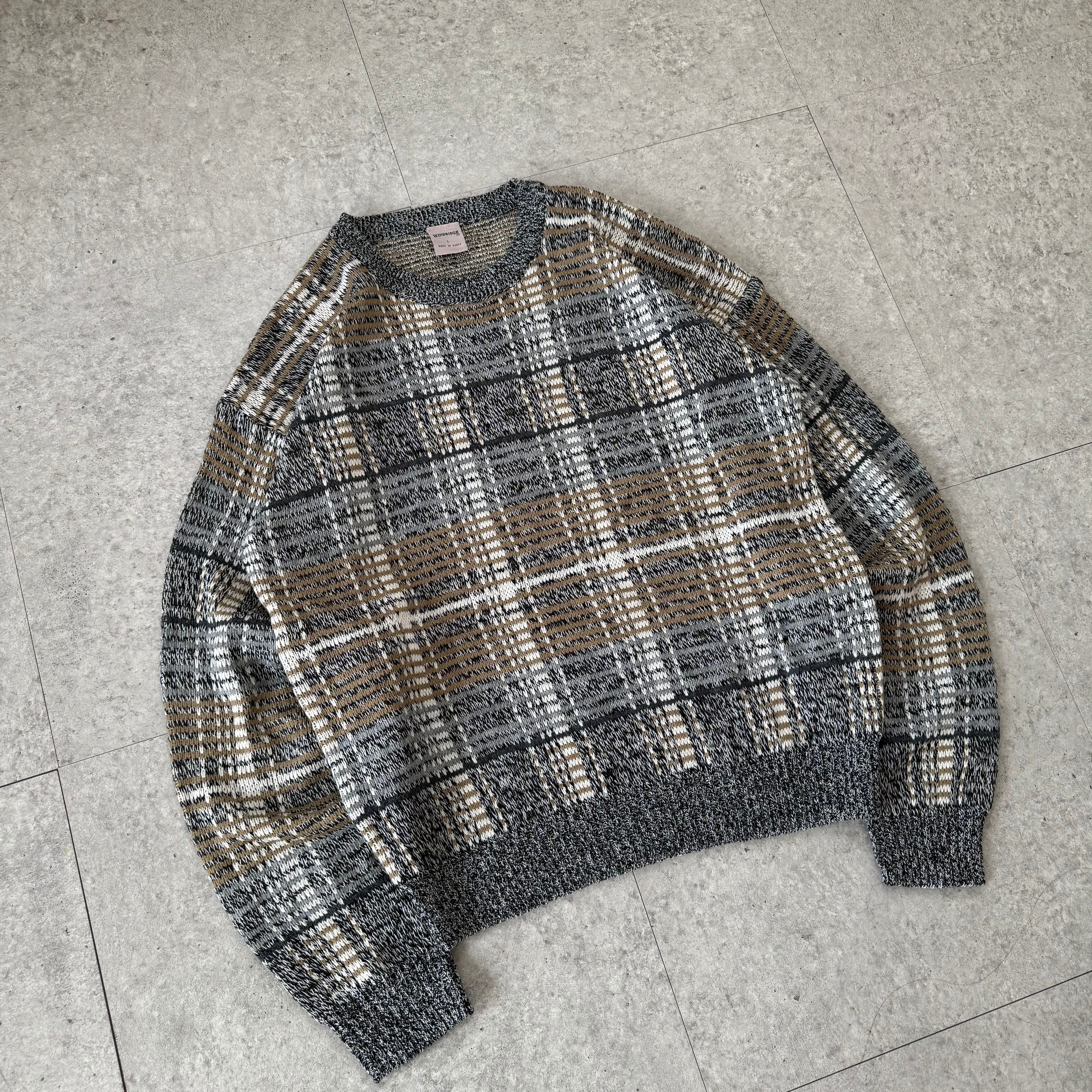 落ち着いたチェック柄のvintageニット。ベージュ×グレーの柔らかい配色で、上品さのある一枚。派手すぎず、でもしっかり雰囲気が出る絶妙なバランス。