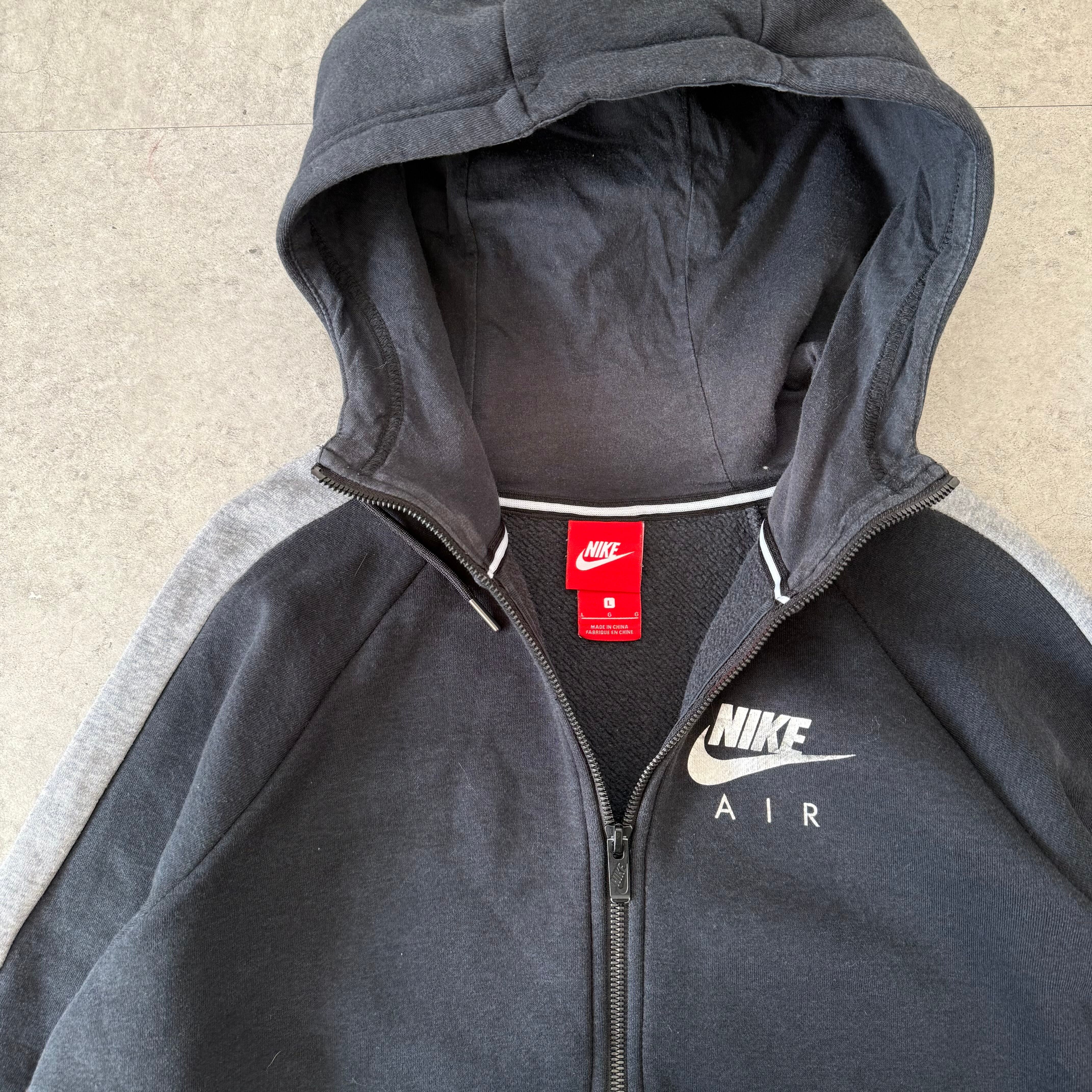 ブラックボディにグレーの切替ライン、胸のAIRロゴが程よく主張する1着。肉厚すぎない生地で落ち感があり、フードの立ち方も綺麗。ジップタイプなのでインナー調整もしやすく、閉めても開けてもシルエットが成立します。
