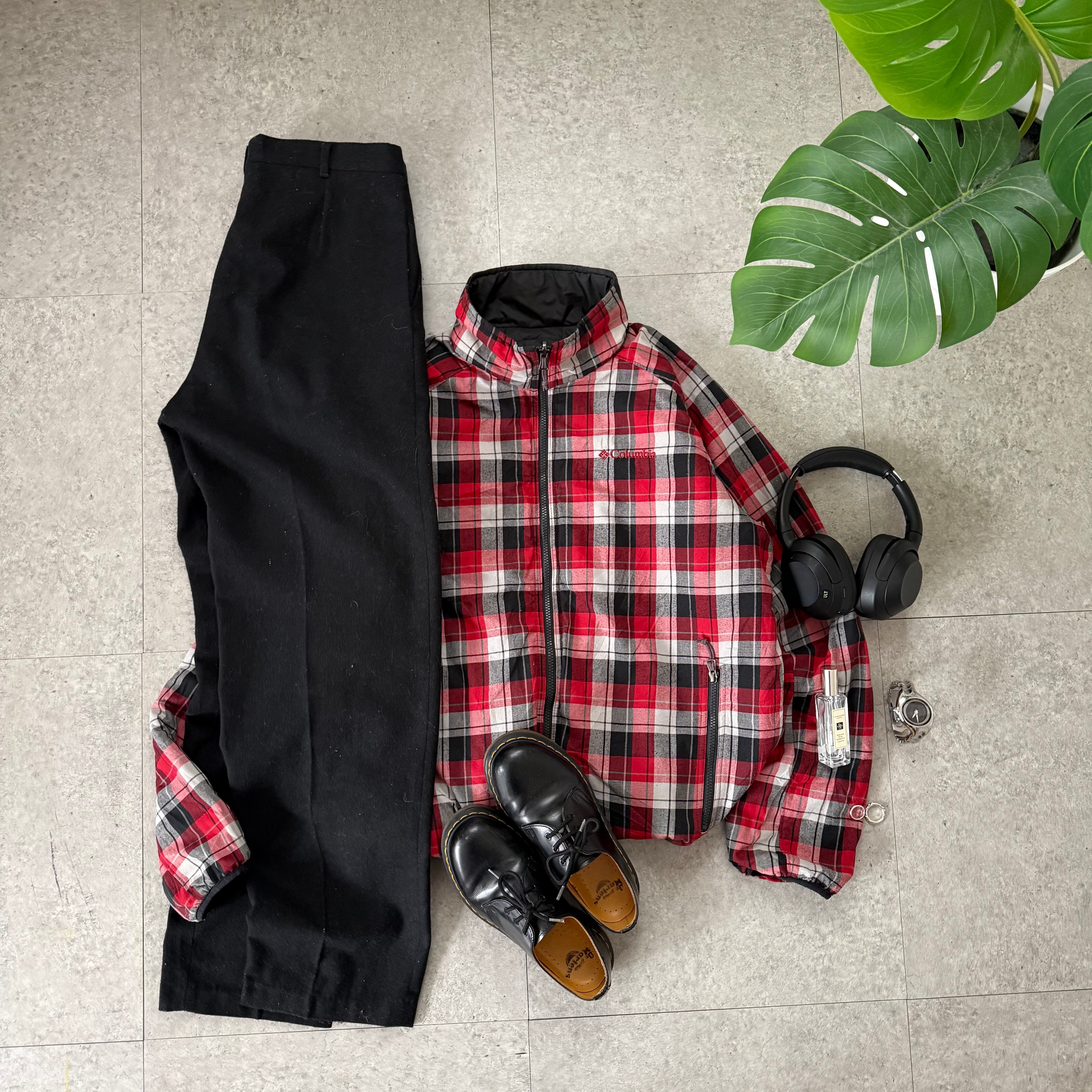 表は無機質な都会的スタイル、裏はアメカジ感のある赤チェックで一気に雰囲気を変えられる万能アウターです。