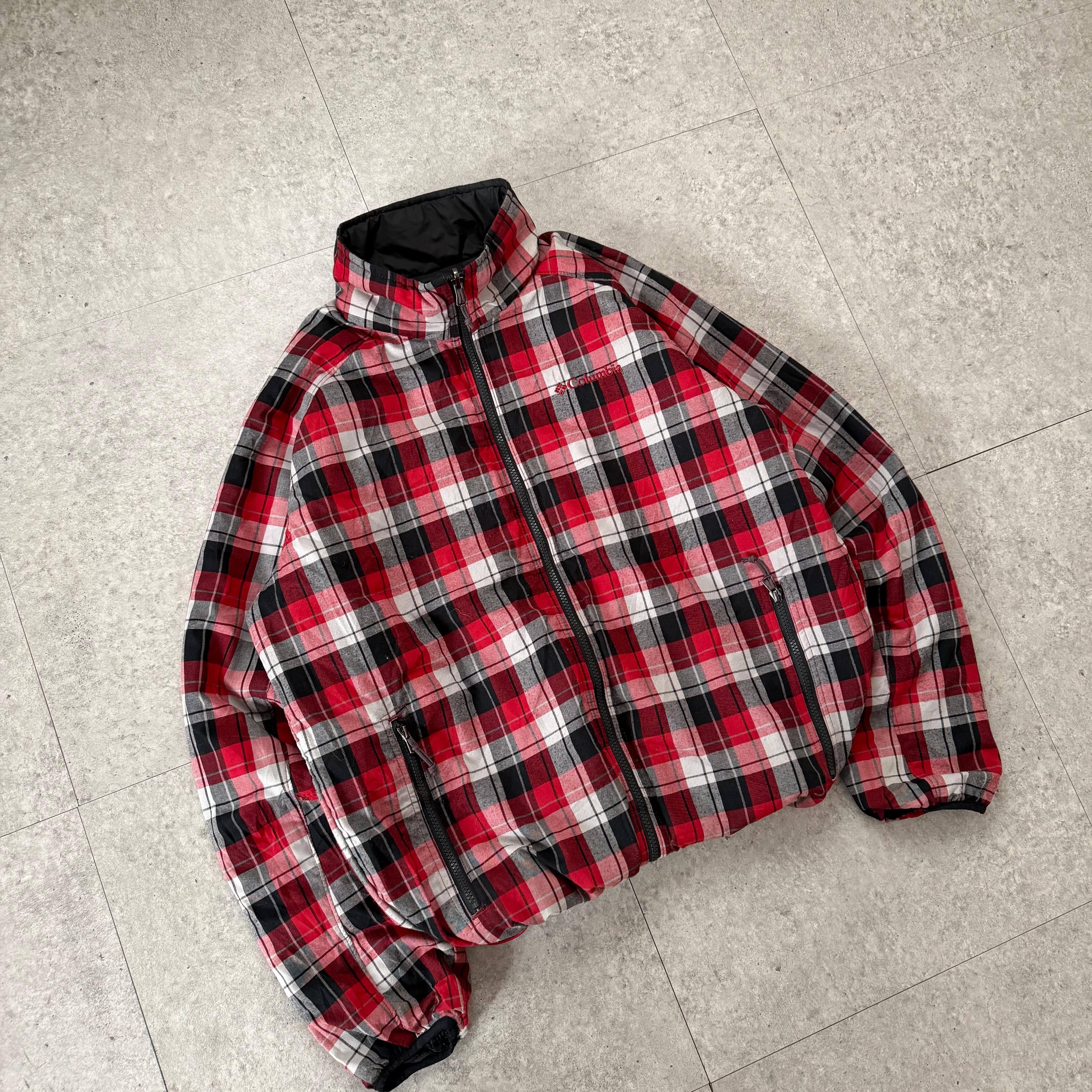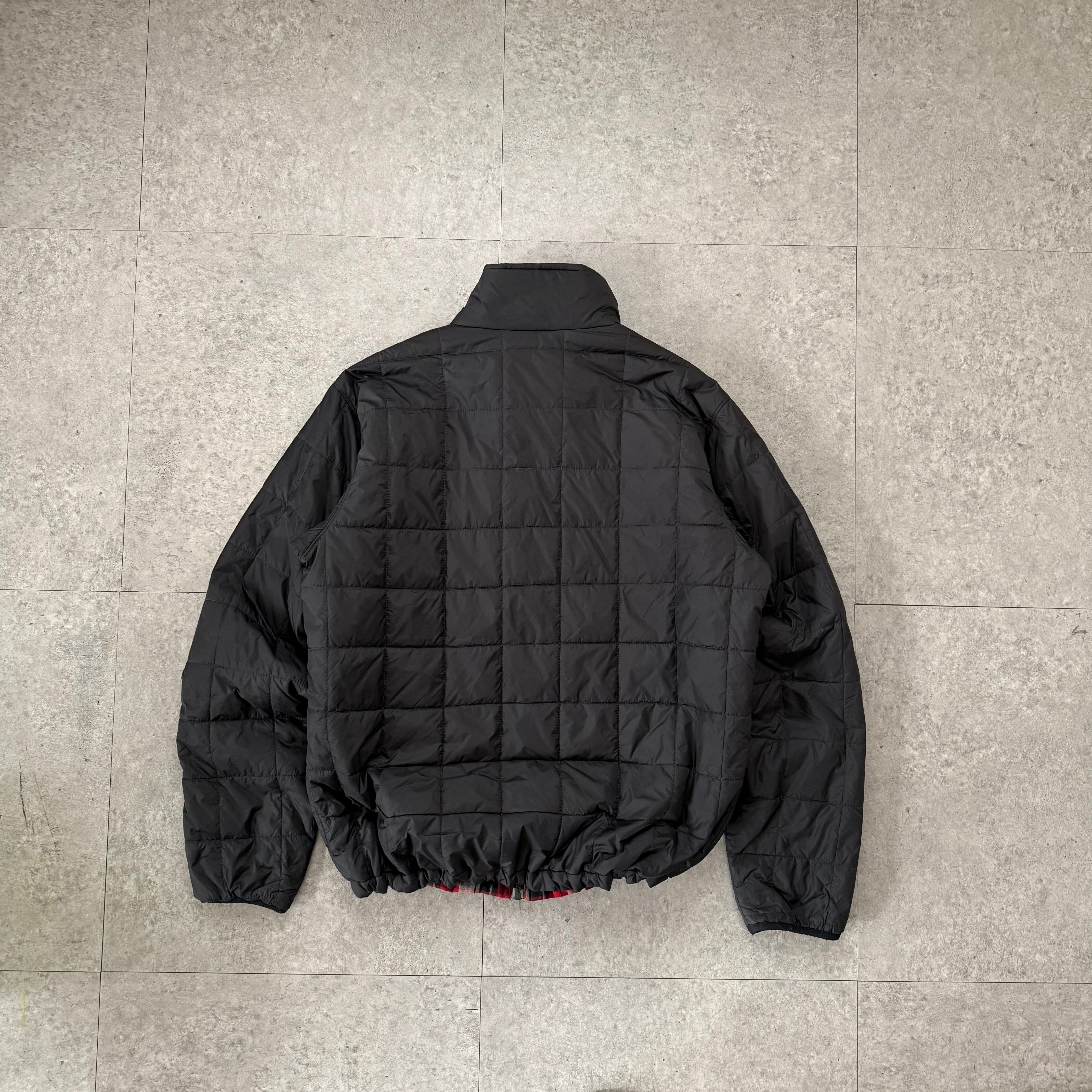 ブラックの中綿ジャケットはシンプルな無地面と、チェック柄のリバーシブル仕様。
