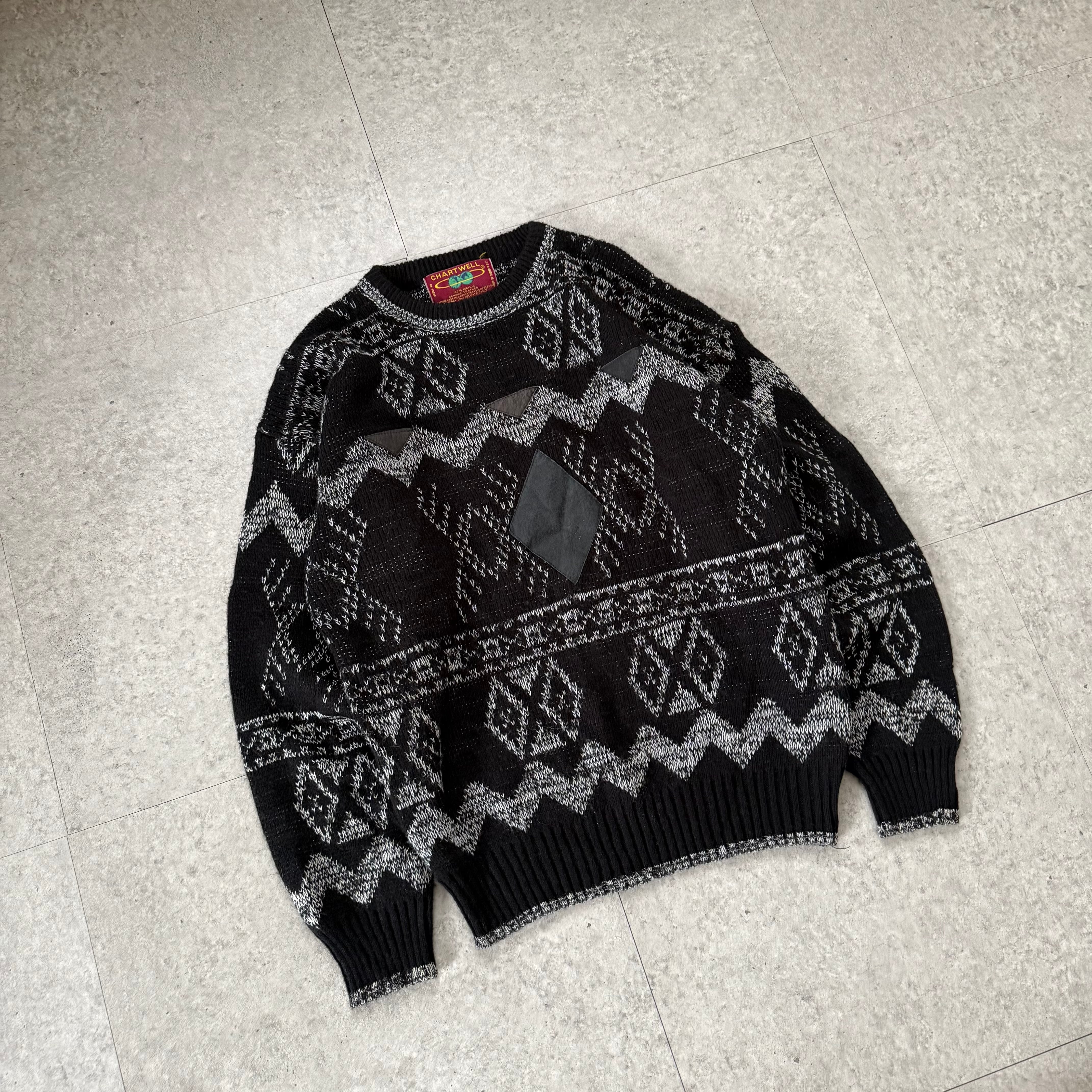 無骨なブラックレザージャケットに、総柄のパターンニットを差し込んだモノトーンスタイル。