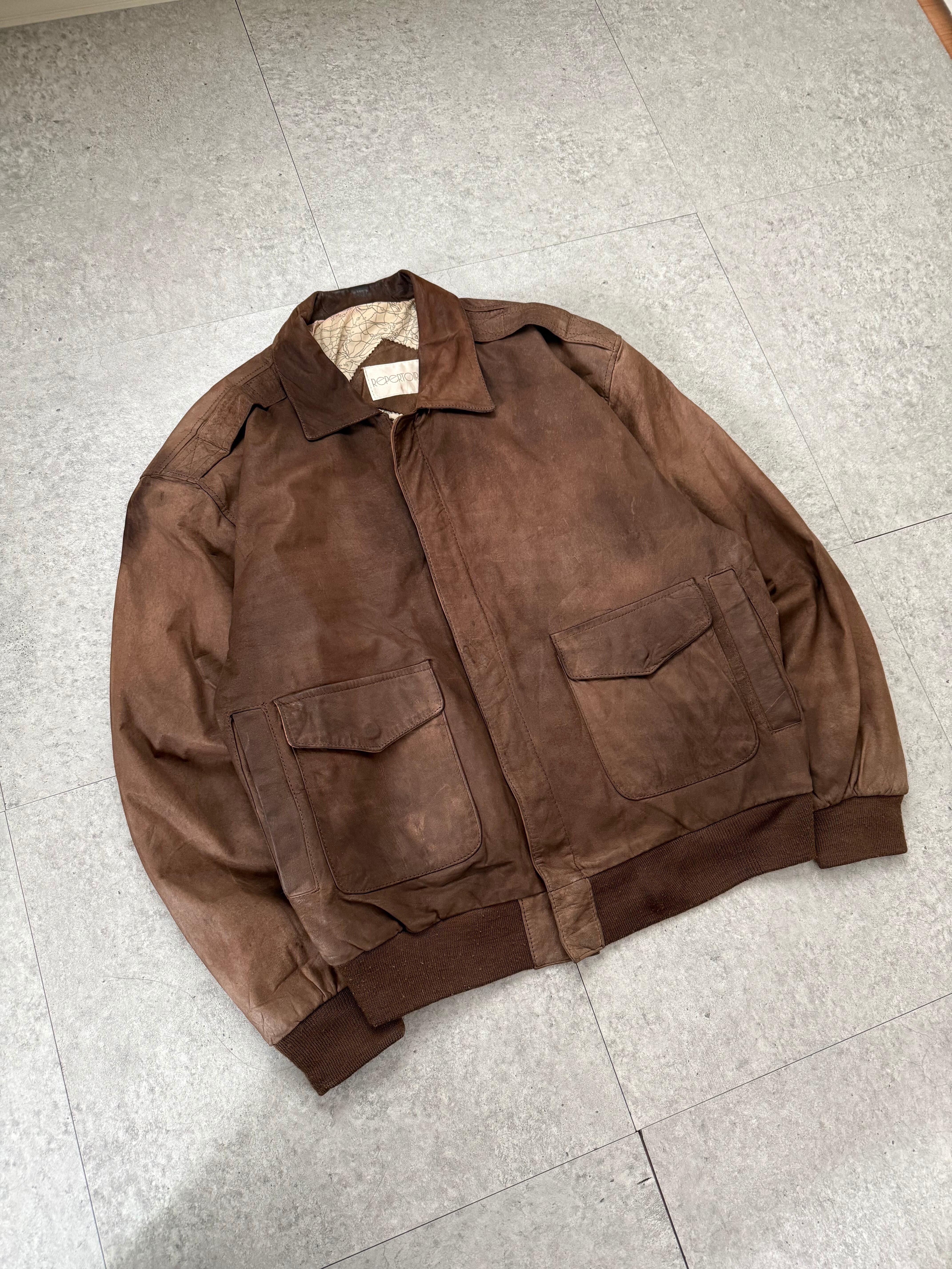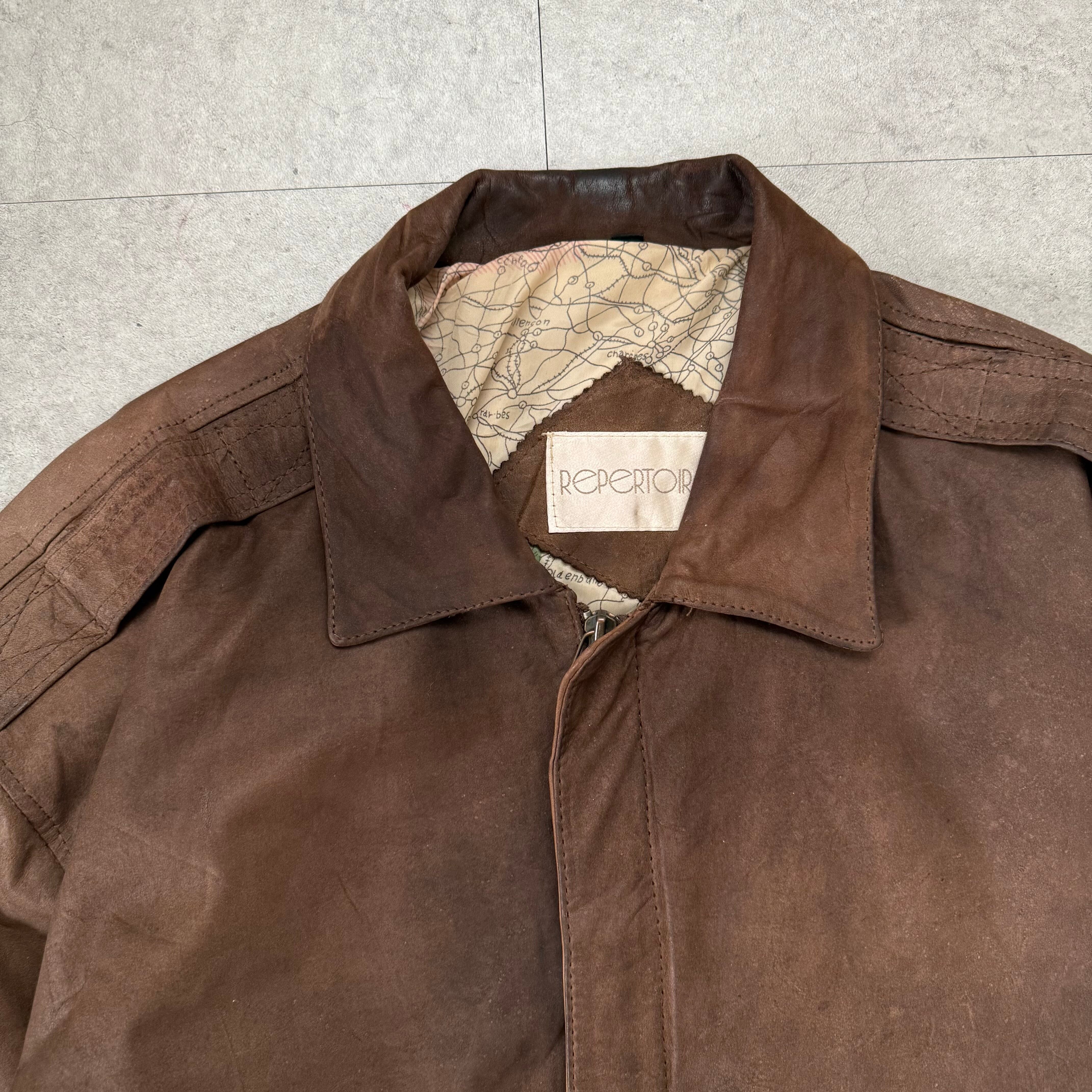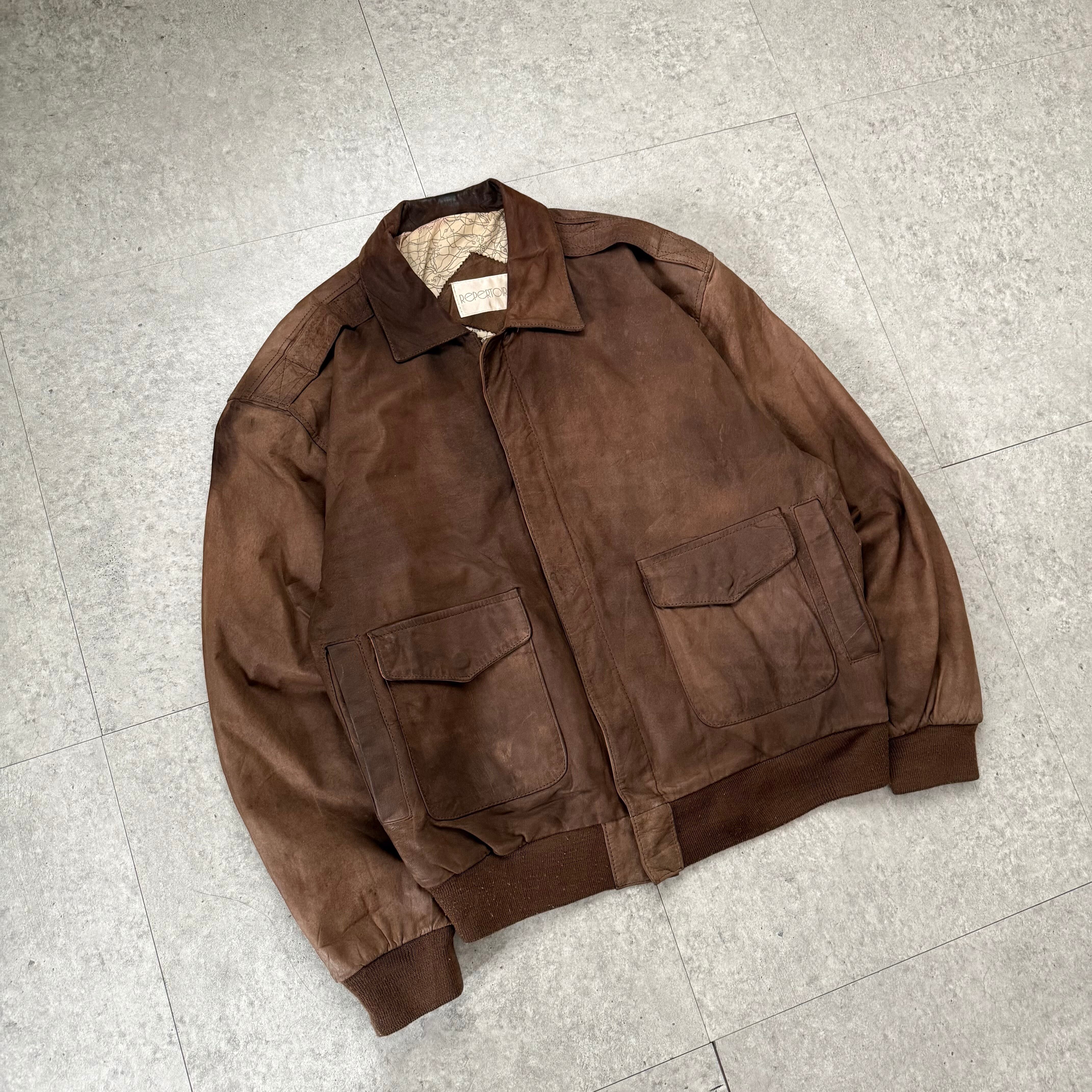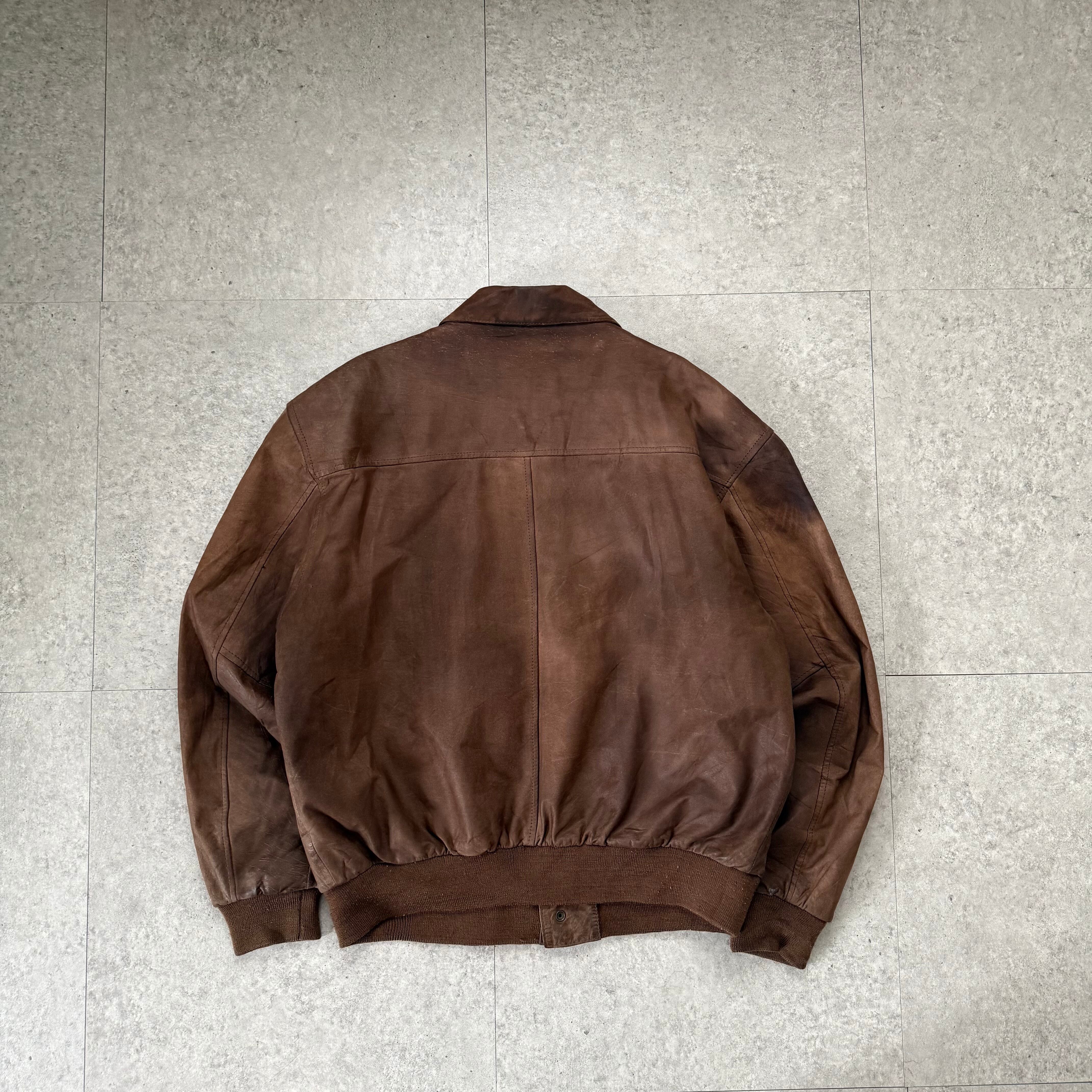 トップスはフェード感のあるブラウンレザージャケット。深みのある色味に、自然な擦れやムラ感が加わりヴィンテージならではの雰囲気を演出。フロントはミニマルな比翼仕様で、フラップ付きの大きめポケットが程よいアクセントに。裾と袖はリブ切り替えで丸みのあるシルエットを作り、着用時に自然とボリュームが出るバランス。内側の総柄ライニングもさりげないポイントで、脱いだときまで抜かりない一着です。
