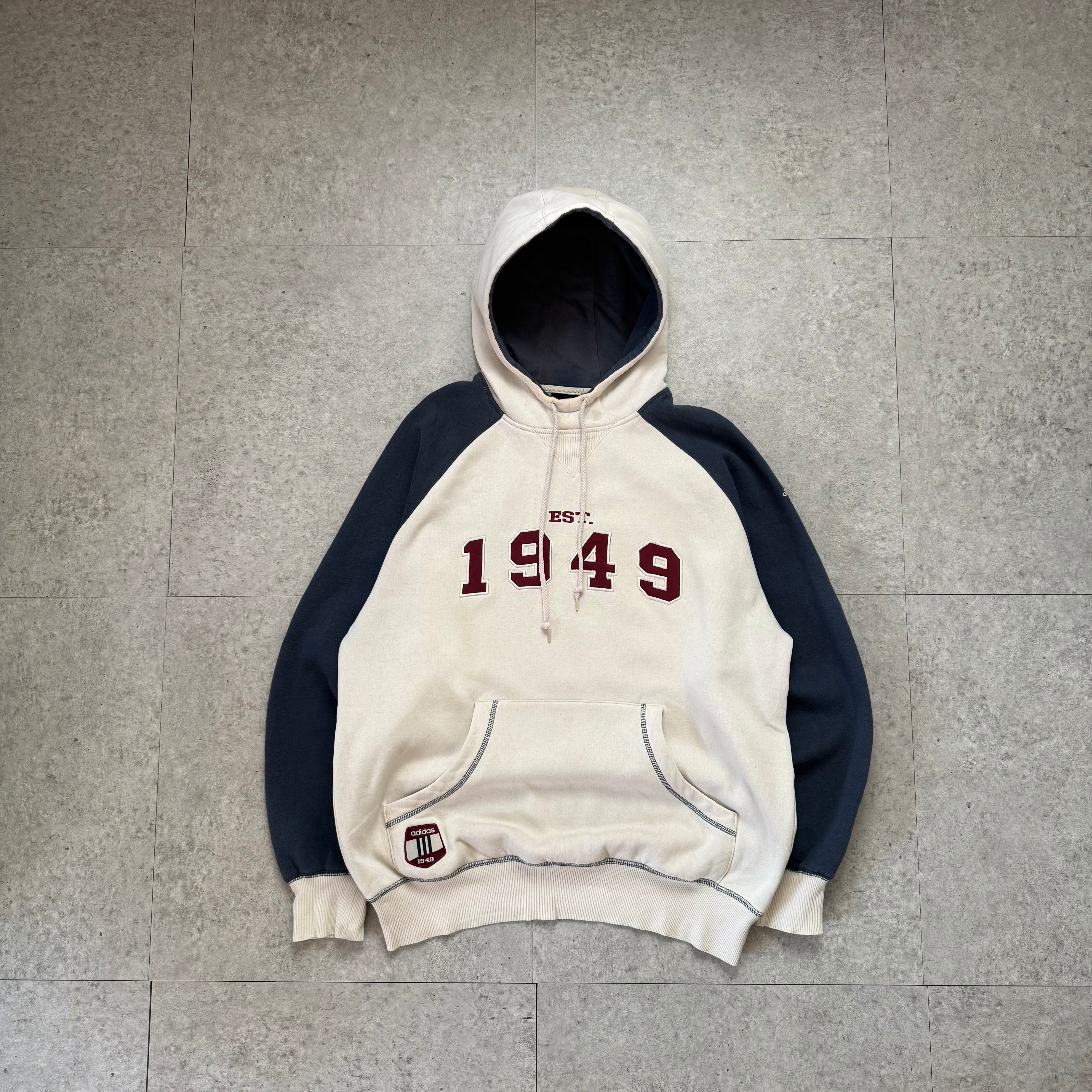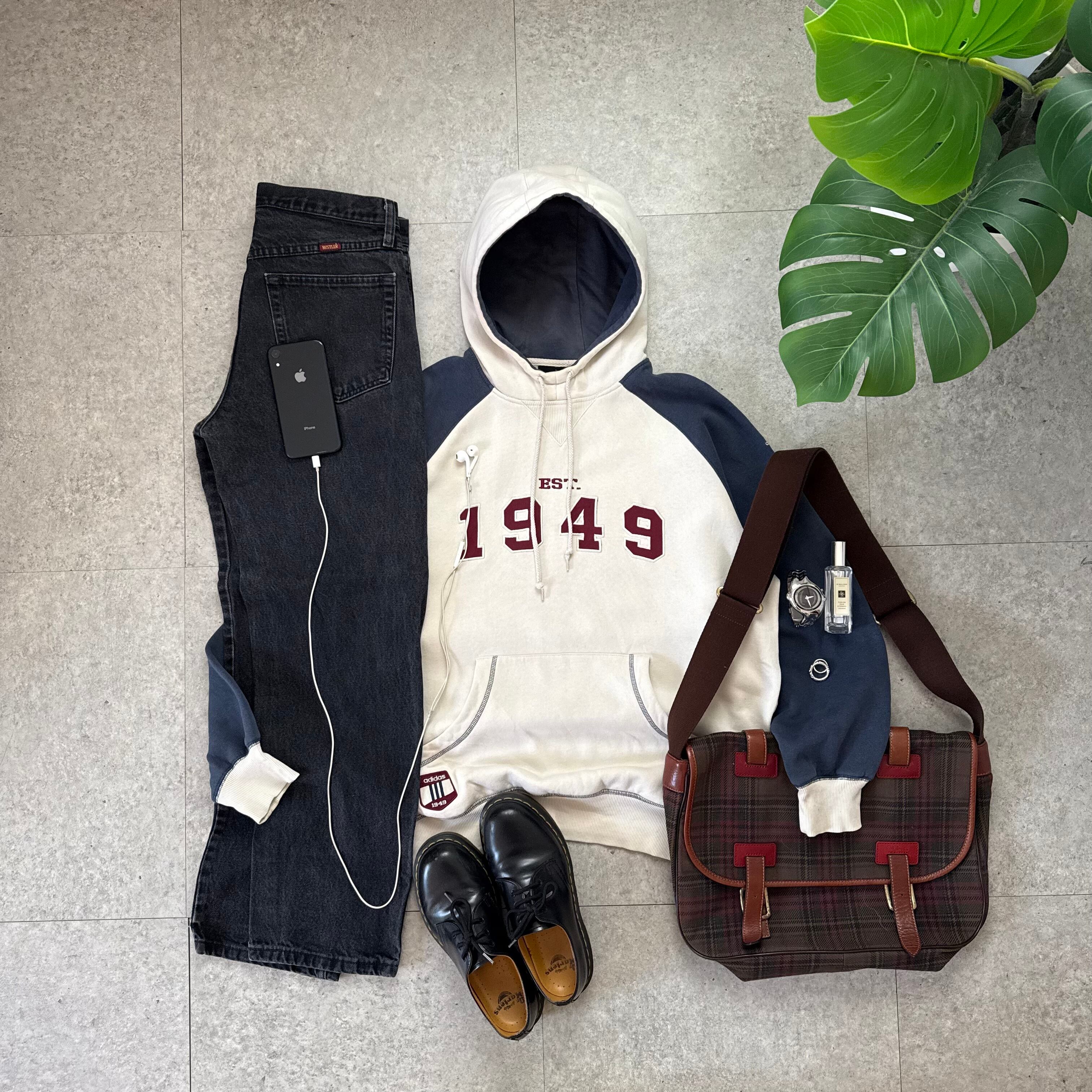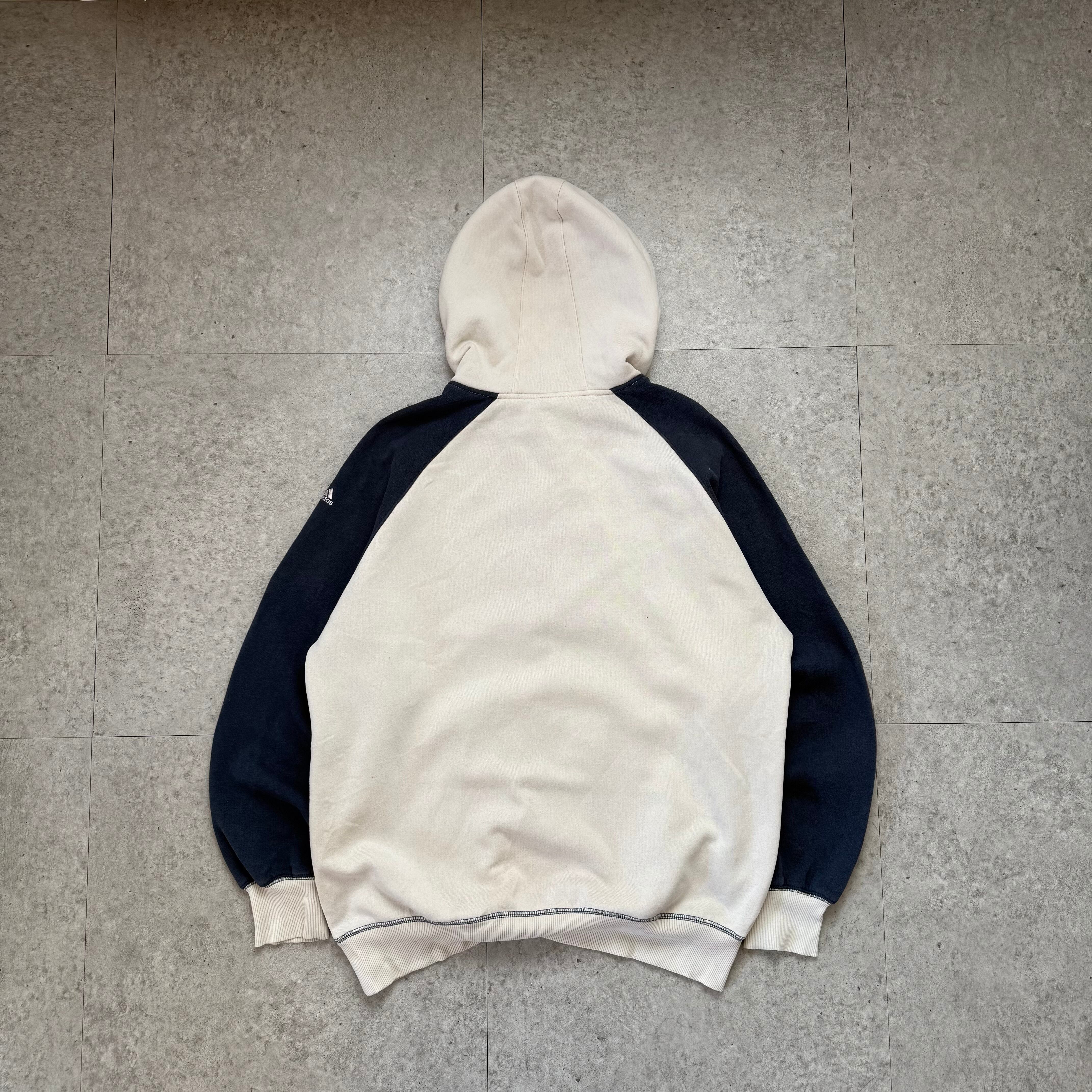 アイボリー×ネイビーの切り替えが映えるadidasのフーディーに、フェード感のあるブラックデニムを合わせた王道ストリートスタイル。