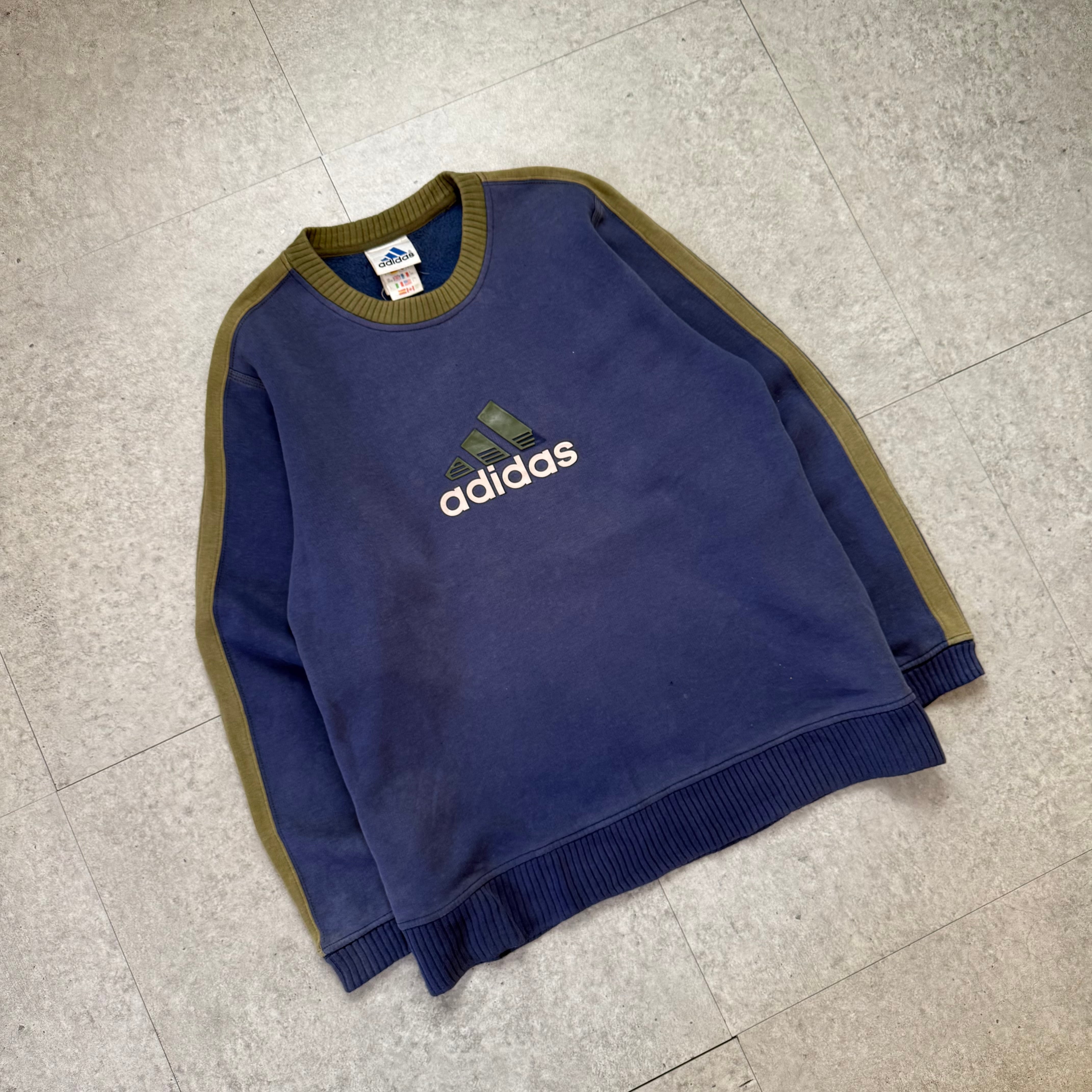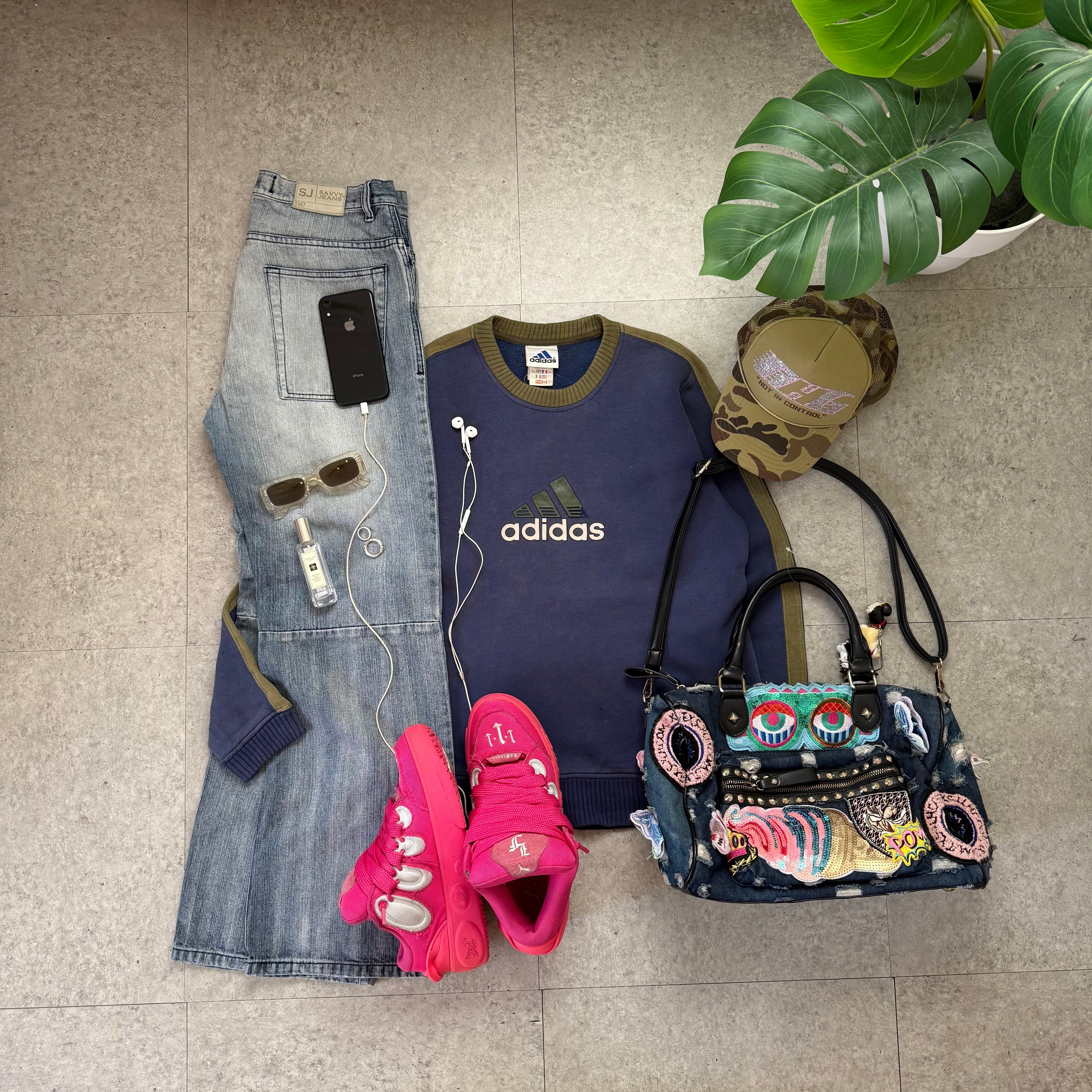 ネイビー×オリーブの切り替えが効いたadidasスウェットに、縦落ちの綺麗なフレアデニムを合わせたストリートミックス。