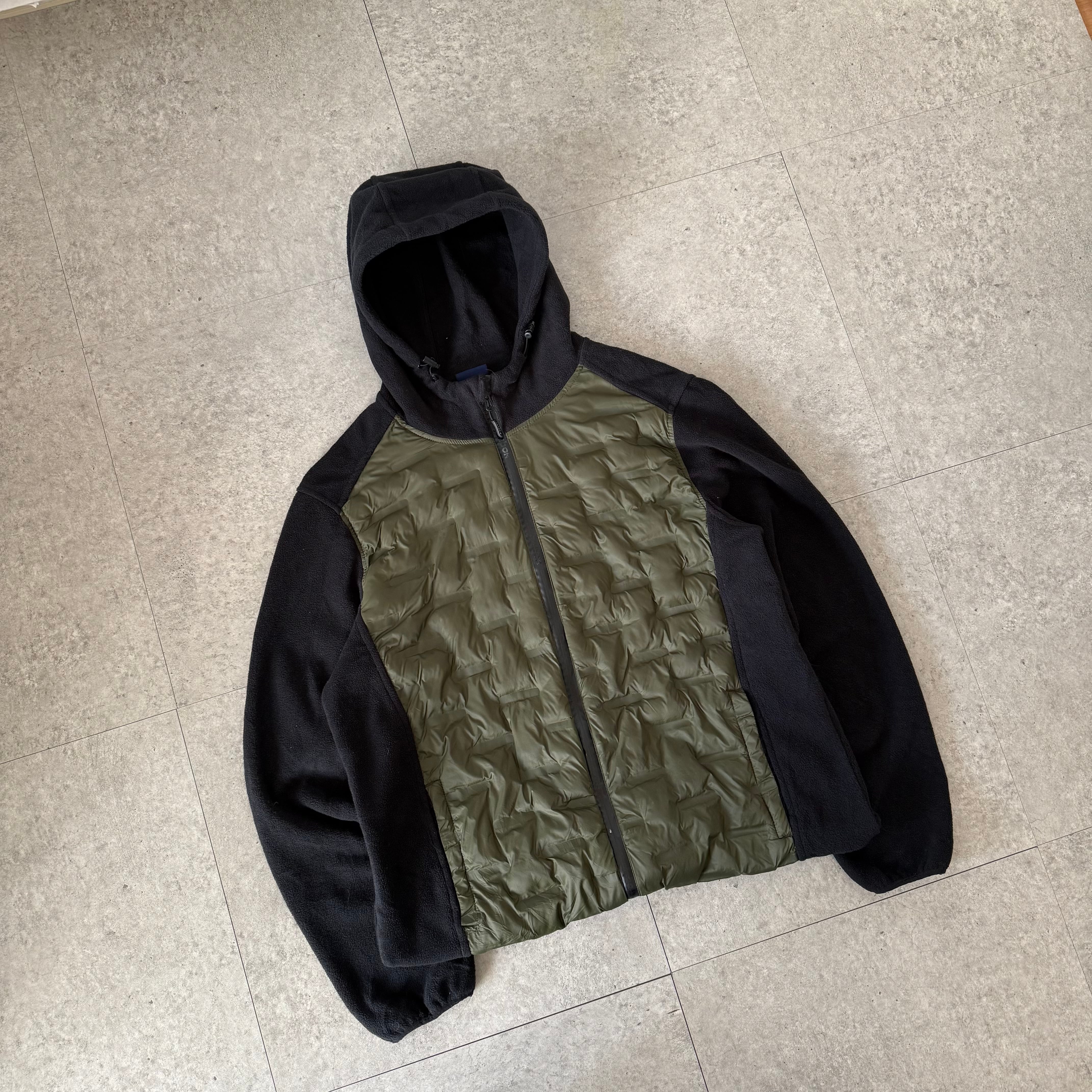 ジャケットはフーディータイプのアウトドアジャケット。フロントのキルティングデザインとフリース素材の袖の切り替えが特徴で、防寒性と動きやすさを兼ね備えた機能的な一着です。カーキとブラックの配色も落ち着いており、アウトドア感がありながらタウンユースにも取り入れやすいデザインです。